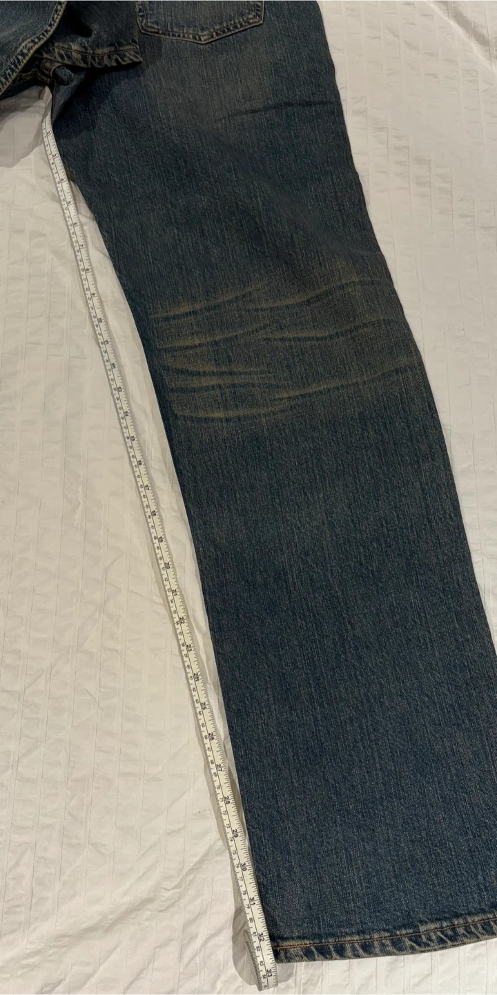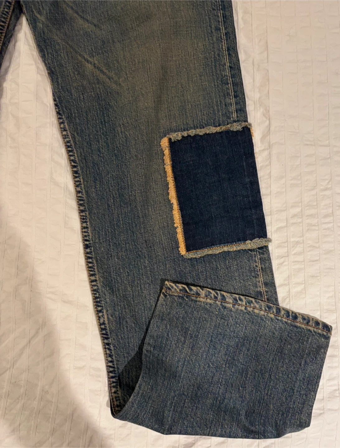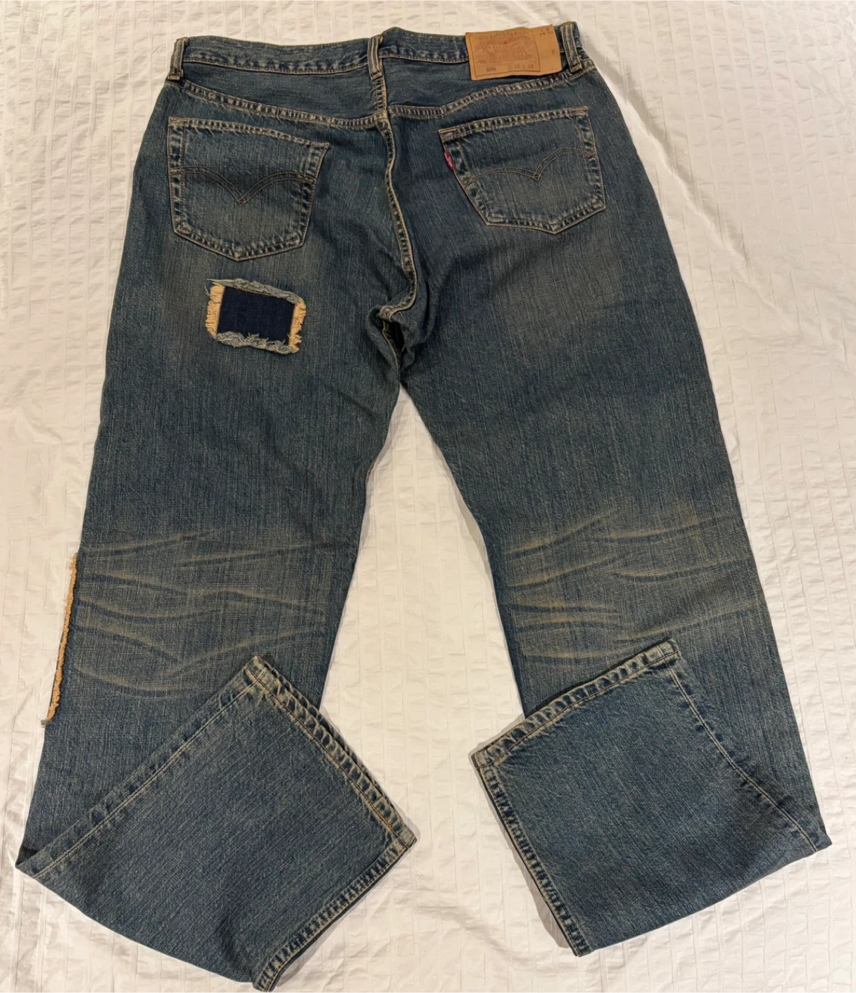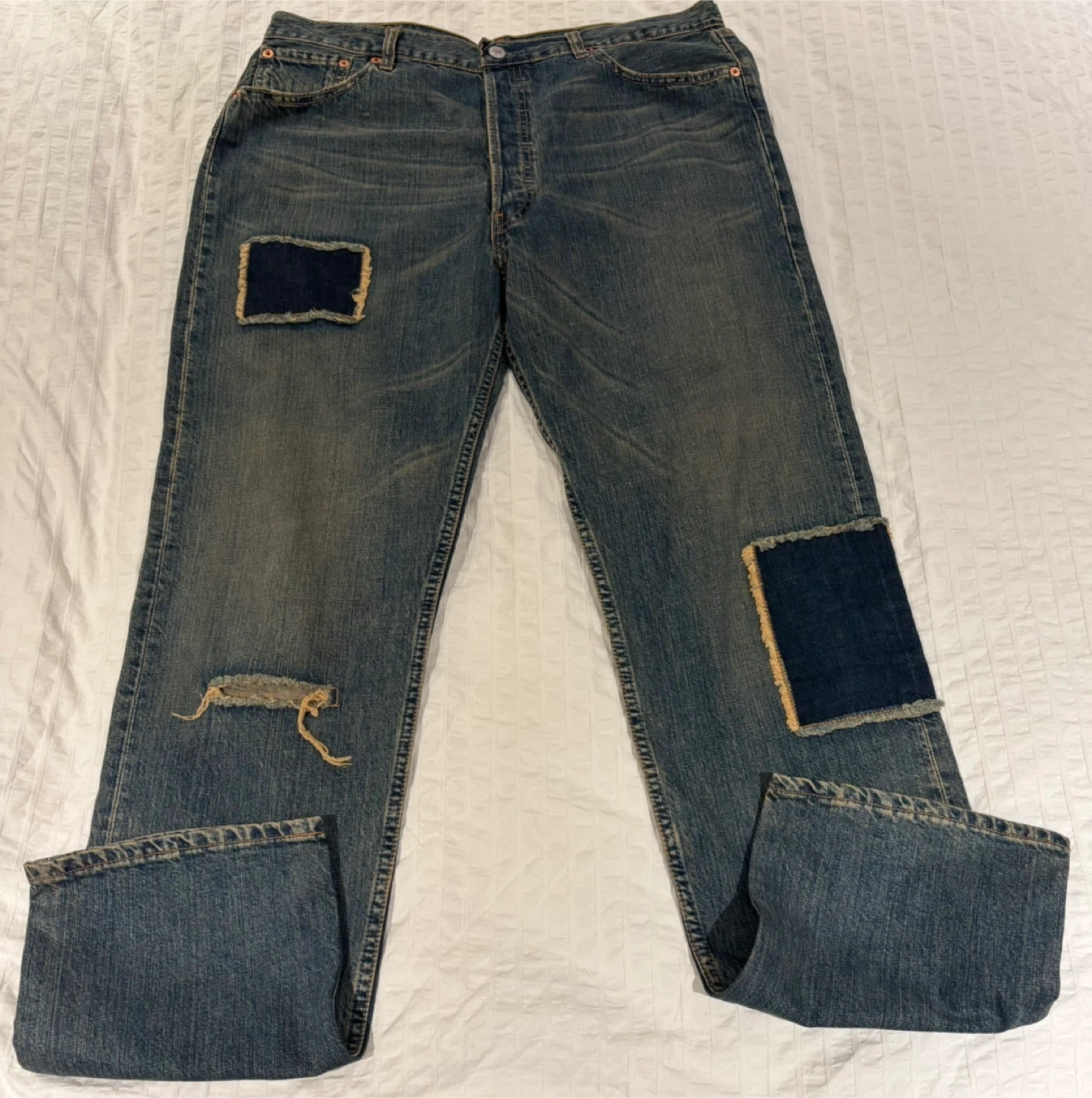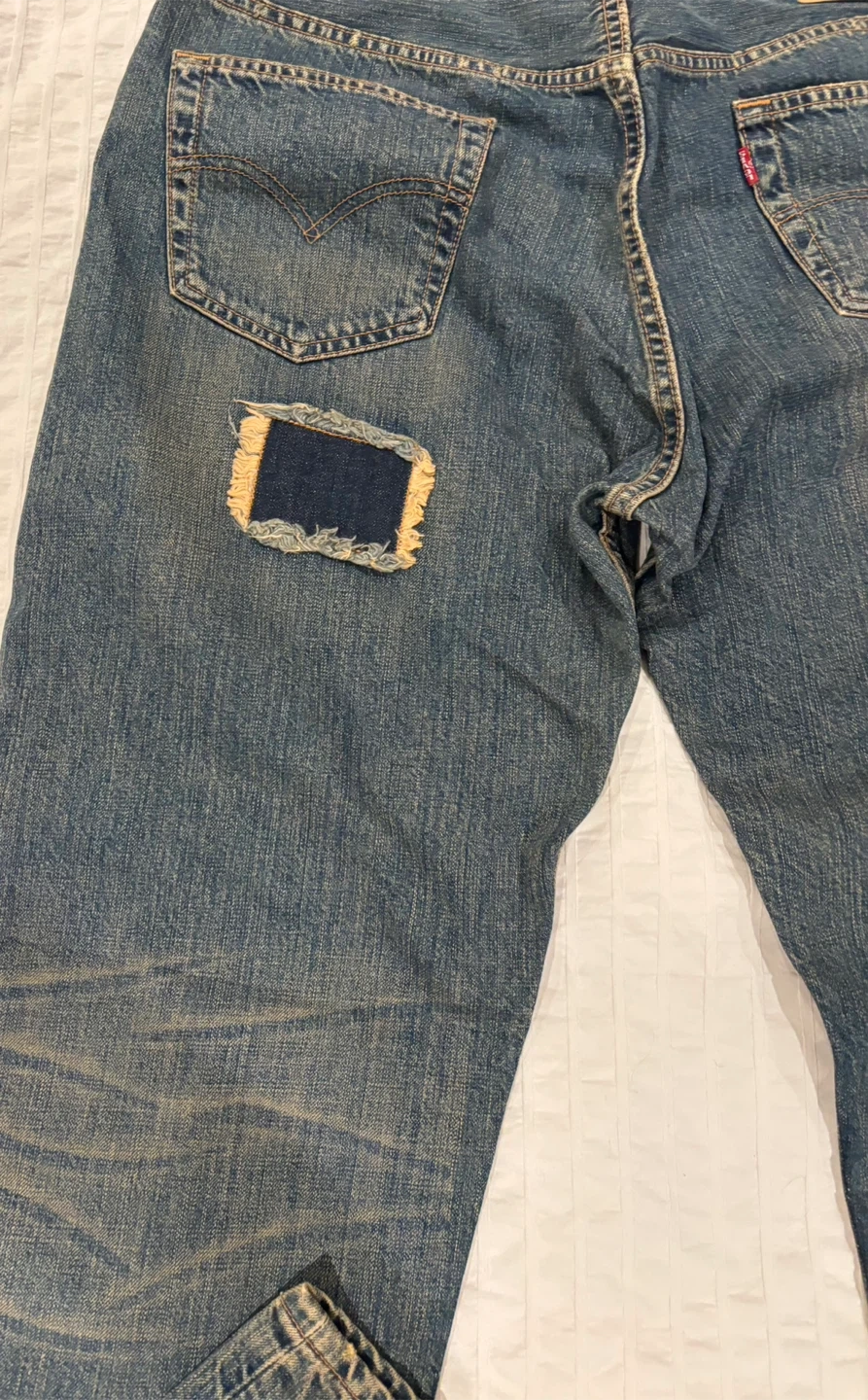Selling a pair of Levi's jeans that have been uniquely customized with patches. They have a cool, worn-in look with some intentional distressing. These jeans are perfect for someone who loves a vintage or upcycled style. They are a standard denim material, and would be a great addition to any wardrobe!