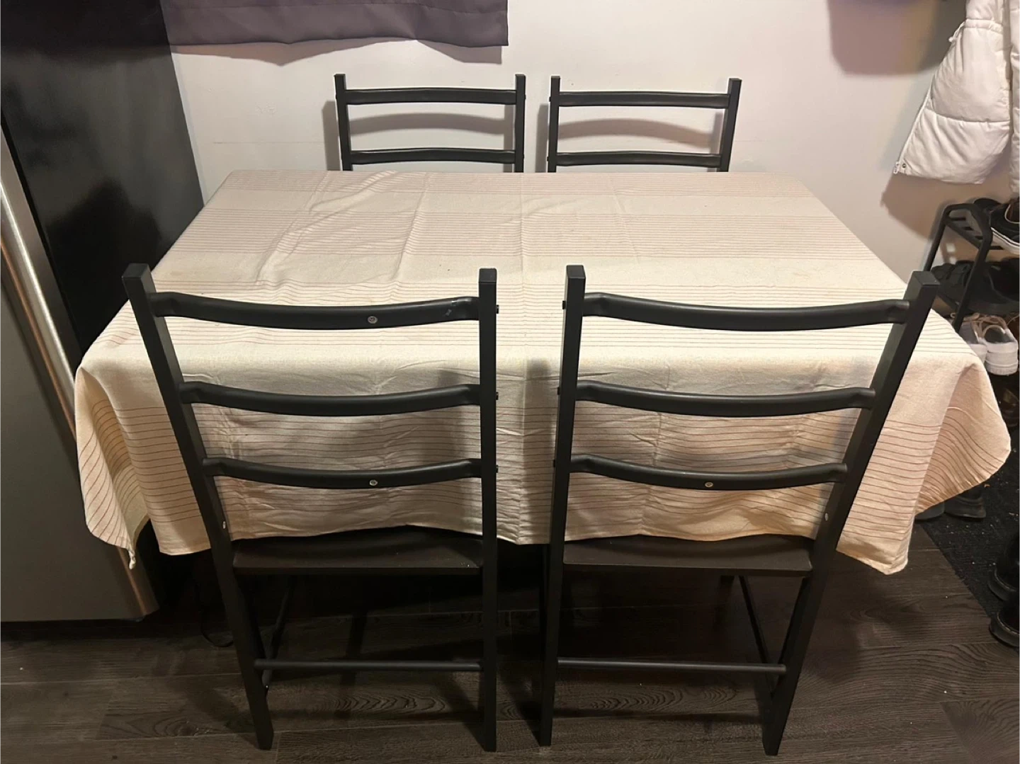 Selling a dining table with four matching chairs. The set is in good condition and perfect for a small dining area or kitchen. The table has a neutral-coloured striped tablecloth. The chairs are black with a ladder back design.