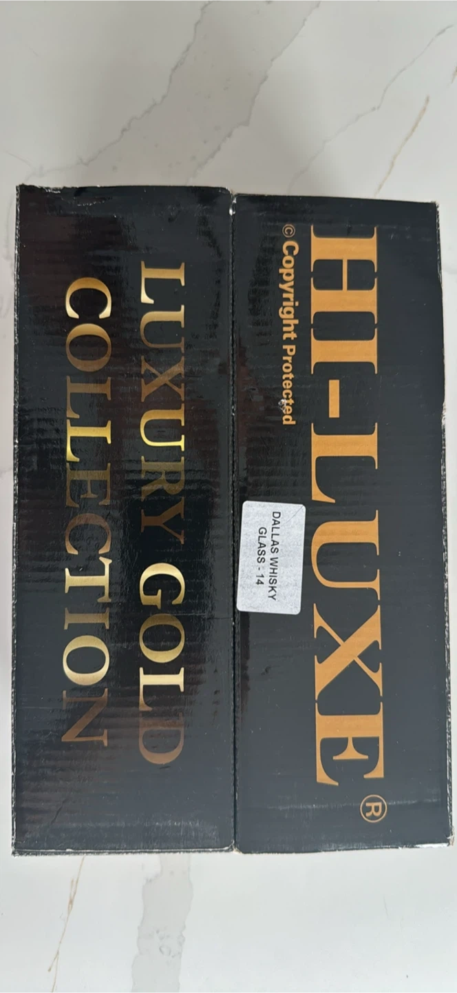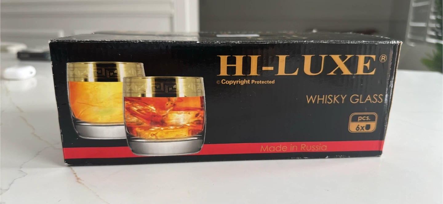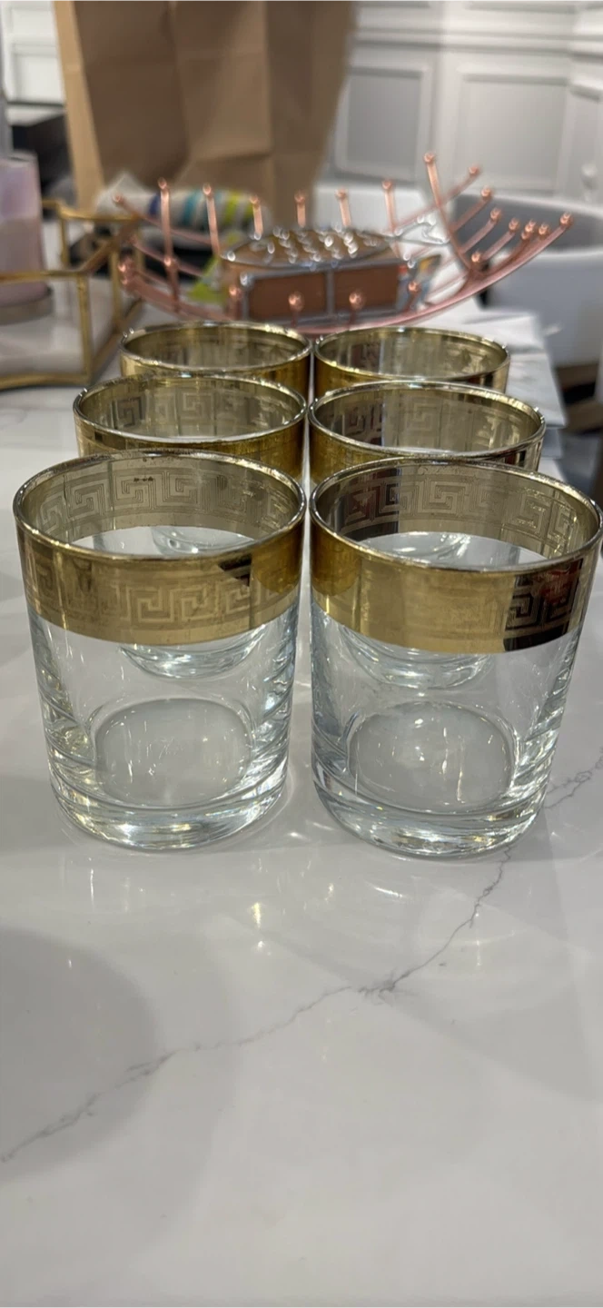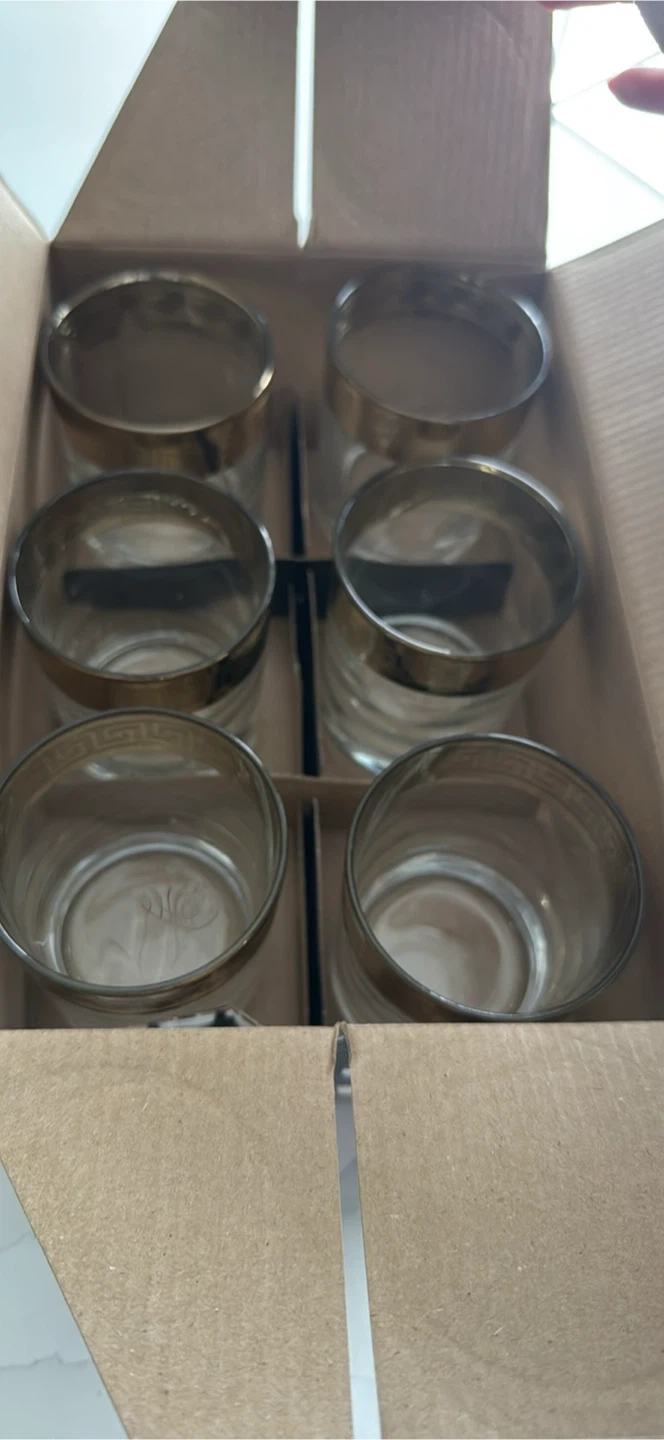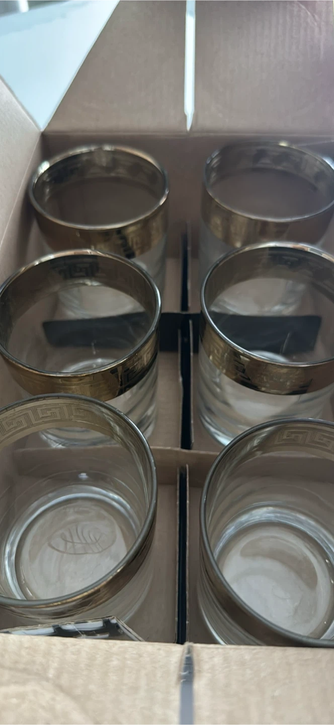 Selling a set of six gold brand-new gold rimmed glasses with a unique design. High quality. Comes in original packaging.