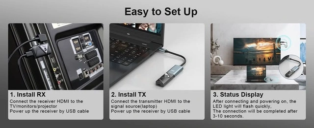 【Plug and Play, easy connection】Say goodbye to the hassle of messy cables, apps. Our wireless HDMI transmitter and receiver is truly plug & play, connecting easily within 3-10 seconds. Save time and eliminate the trouble of traditional wired connections, keeping your room or office neat and tidy.