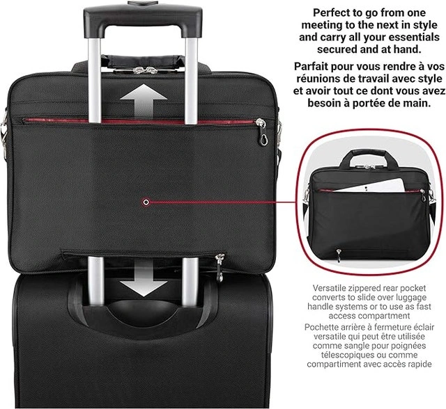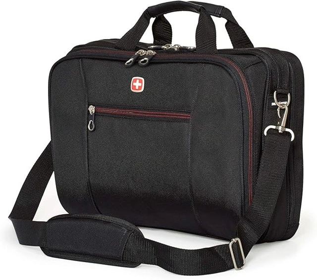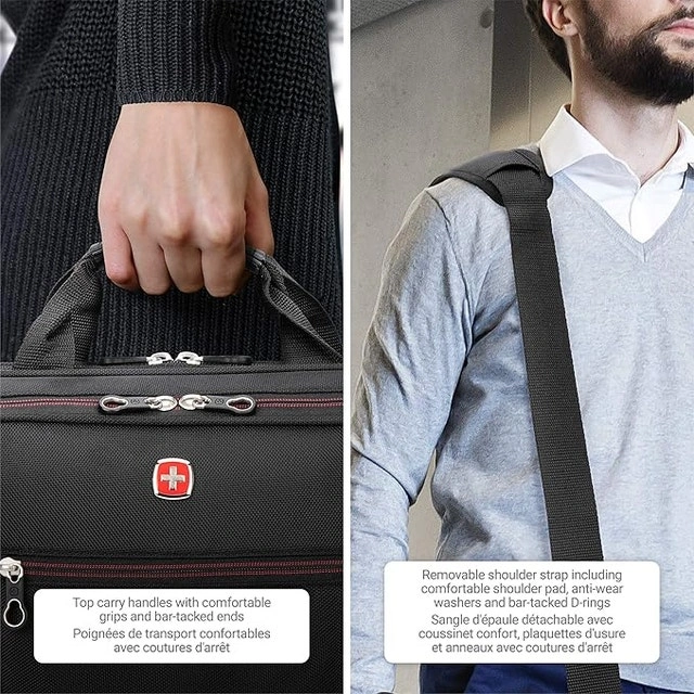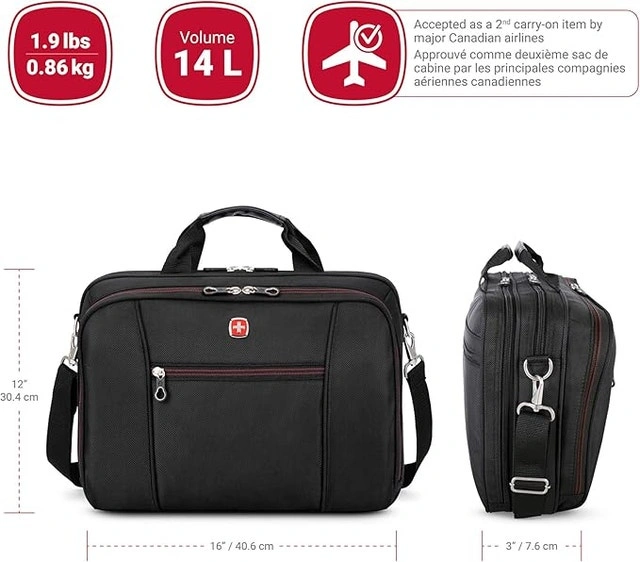 ULTIMATE ORGANIZATION: Designated padded compartment to store a 15.6" laptop, allowing to carry your laptop without bringing an additional bag or sleeve. Separate sections and compartments to fit tablets, cell phones, cables, power banks, pens, legal-size file folders and much more. PACKING VERSATILITY: Attentively designed for on-the-go professionals this multifunctional portfolio with laptop compartment is perfect to go from one meeting to the next in style and carry all your essentials secured and at hand. Including three large compartments accessible from the outside and multiple organizer features, you can have a quick and easy access to anything packed inside. INNOVATIVE DESIGN: This SWISSGEAR lightweight, multifunctional and cleverly designed laptop bag has carry-on dimensions approved as a 2nd item by major Canadian airlines. Our innovative versatile zippered rear pocket converts to slide over luggage handle systems when needed. If you need to charge your cell phone during the trip, no worries, the side-by-side designated pockets for the phone and the power bank are integrated into the organizer. SUPERIOR COMFORT: Ergonomically designed to minimize shoulder and neck pain, this SWISSGEAR laptop bag comes with a contoured, padded, adjustable and removable shoulder strap. The anti-glide surface of the pad prevents the bag from slipping off the shoulder too easily, while avoiding damage to your garments. The built-in sturdy top carry handles with grips and a quick loop to slide over luggage handle system offer the alternatives to carry the bag or secure it hands-free. DURABILITY AND QUALITY: Inspired by professionals, this entire bag was made elegant but sturdy, functional and stylish. All the materials and features, engineered to withstand the test of time. Dimensions: 16”x12”x4”, 40.6x30x10 cm. Weight 2.8 lbs /Dimensions: 16”x12”x4”, 40.6x30x10 cm. Weight 2.8 lbs / 1.3 kg. Notebook computer case. Fully padded and adjustable computer compartment; holds most 15.6-Inch notebook computers