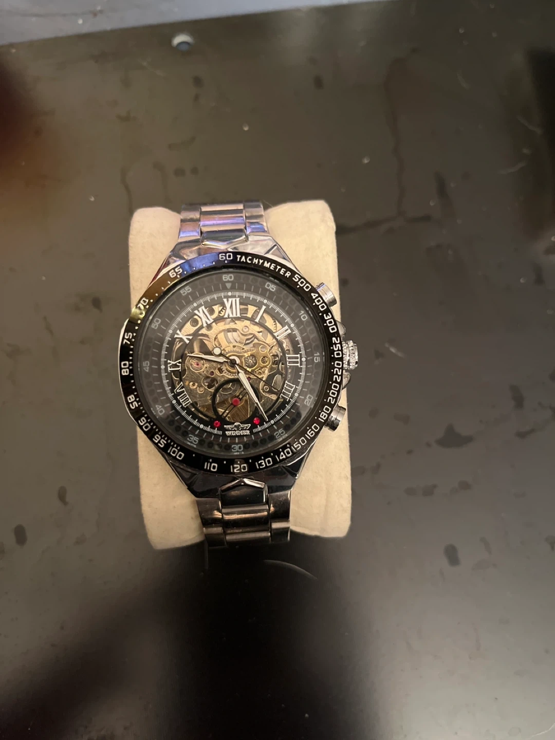 Selling a WINNER skeleton automatic watch! It features a stainless steel band and a unique skeleton dial, so you can see the inner workings of the watch. The dial also has a tachymeter around the edge. It's in great condition!