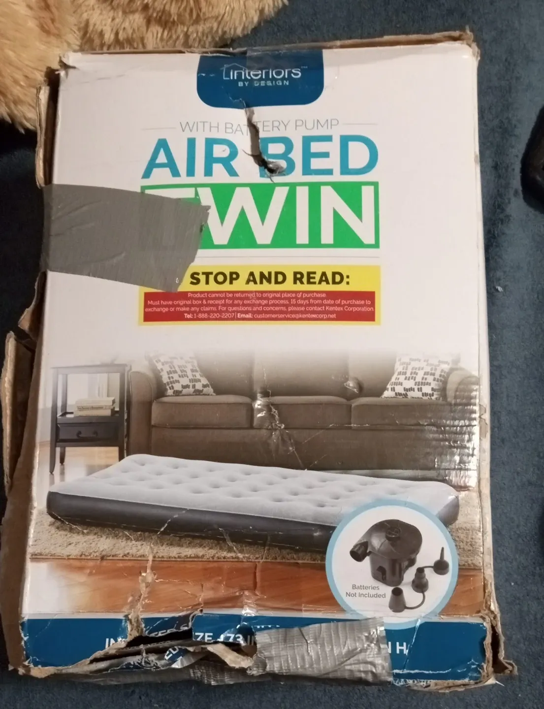Selling a Linterior twin air bed that comes with a battery pump. The box is included, although it's a bit worn. Please note that batteries are not included for the pump