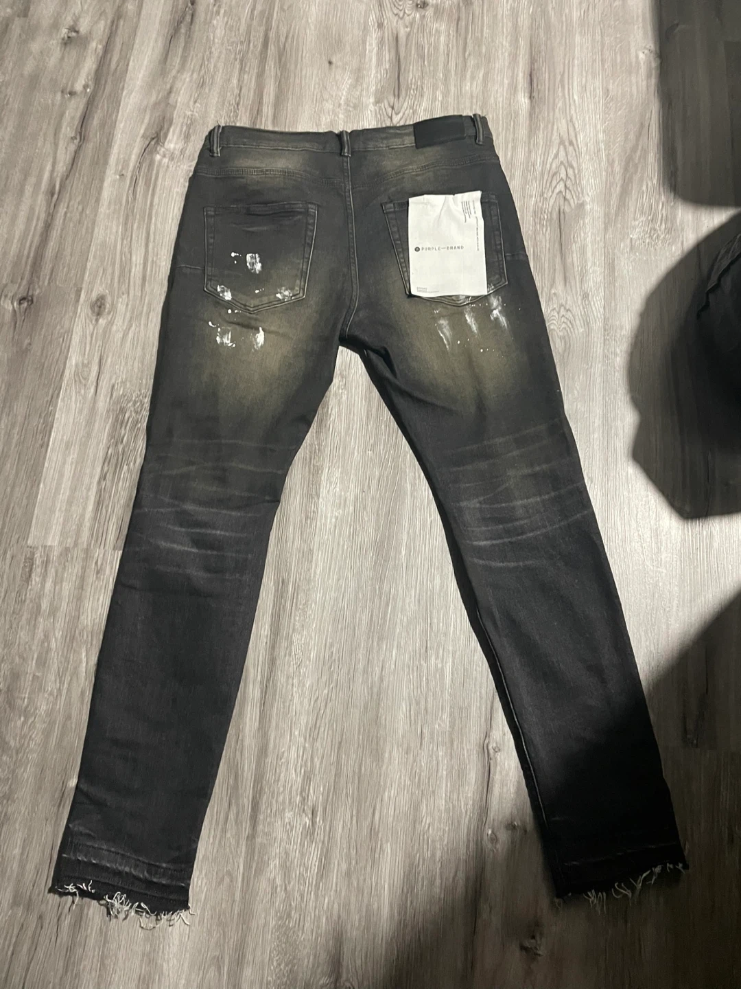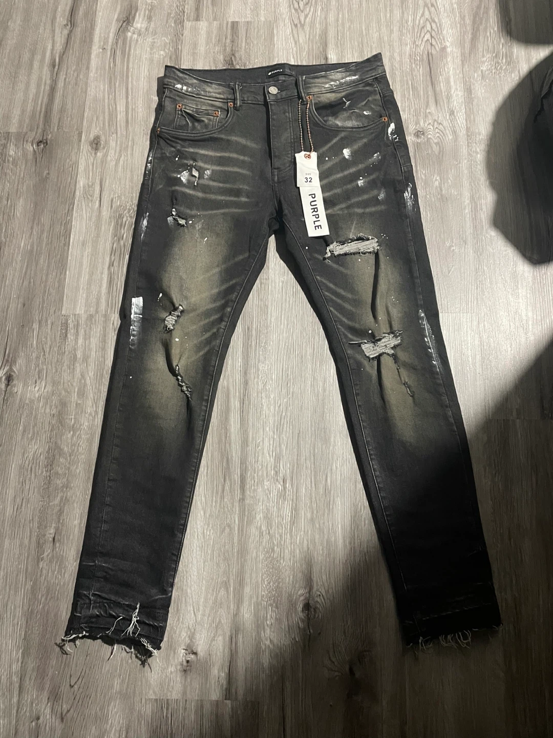Selling a pair of Purple Brand jeans in size 32. They feature a cool distressed design with paint splatters and rips. Made from a blend of 99% cotton and 1% cow leather patch. These jeans are sure to add some edge to your wardrobe! Pick Up Only