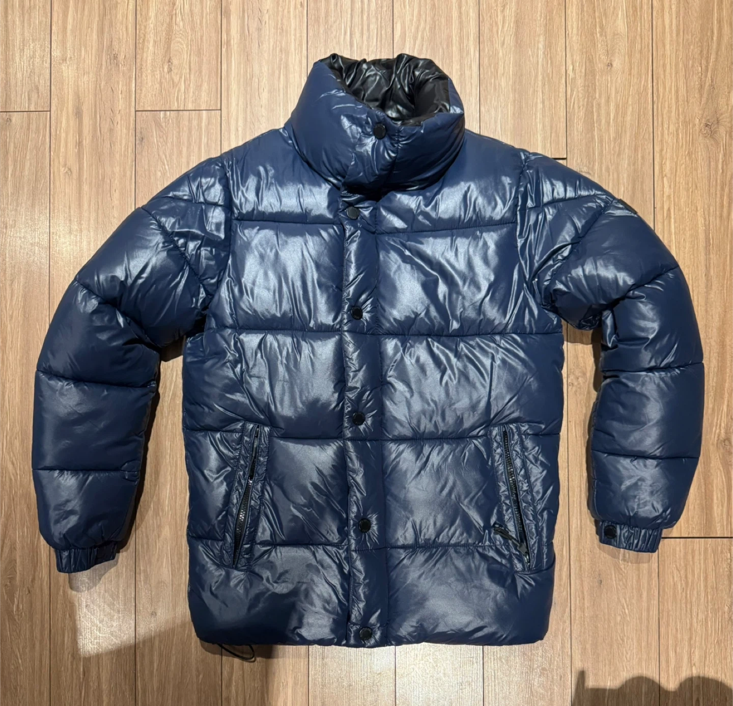 Selling a stylish blue winter puffer jacket, perfect for staying warm during the colder months! It features a high collar and zippered pockets for added convenience and style. Used for one winter season (Winter 2023). It comes with a suitbag. I have black and blue on my listing. You can get both for $100.00.