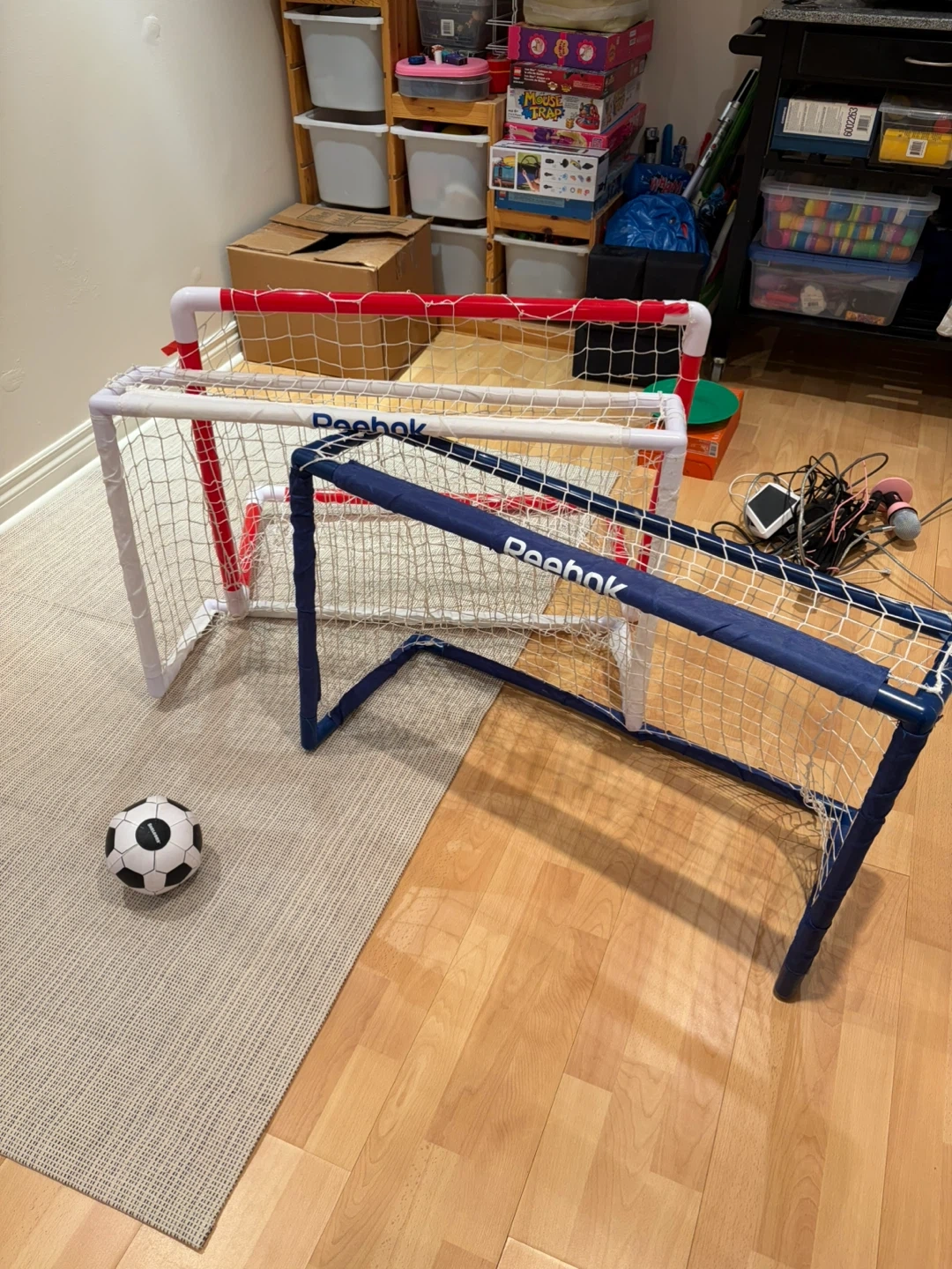 Selling a set of Reebok soccer goals for kids! Great for some backyard fun and getting the little ones active. One goal is blue and the other is red and white. A soccer ball is also included!