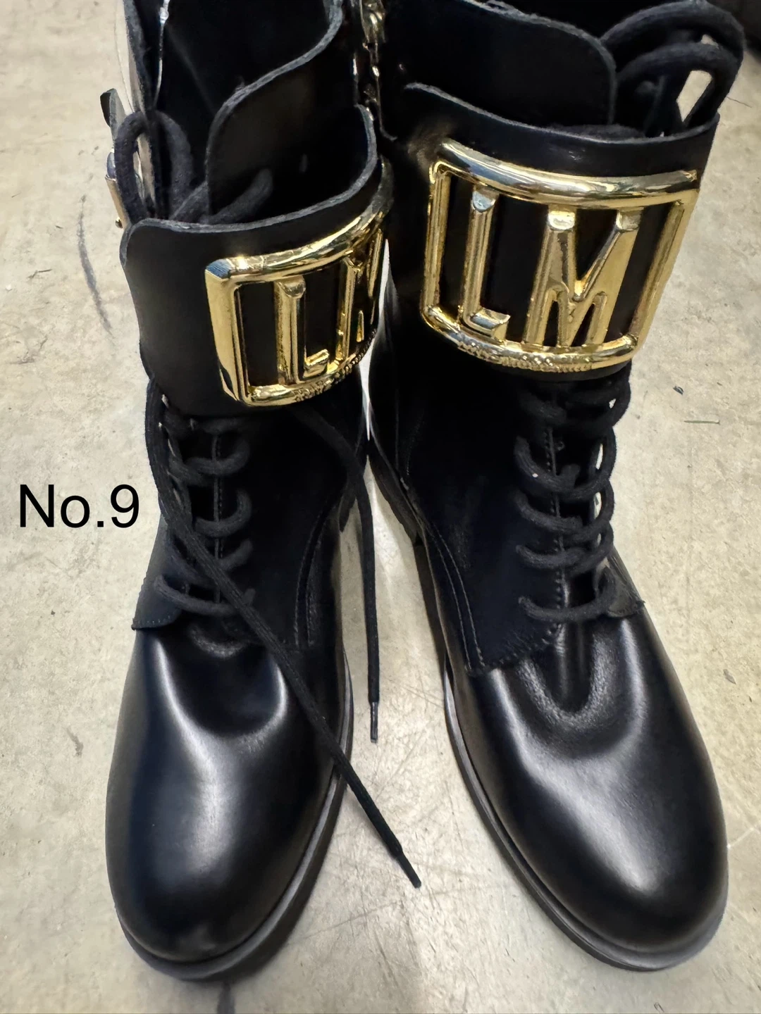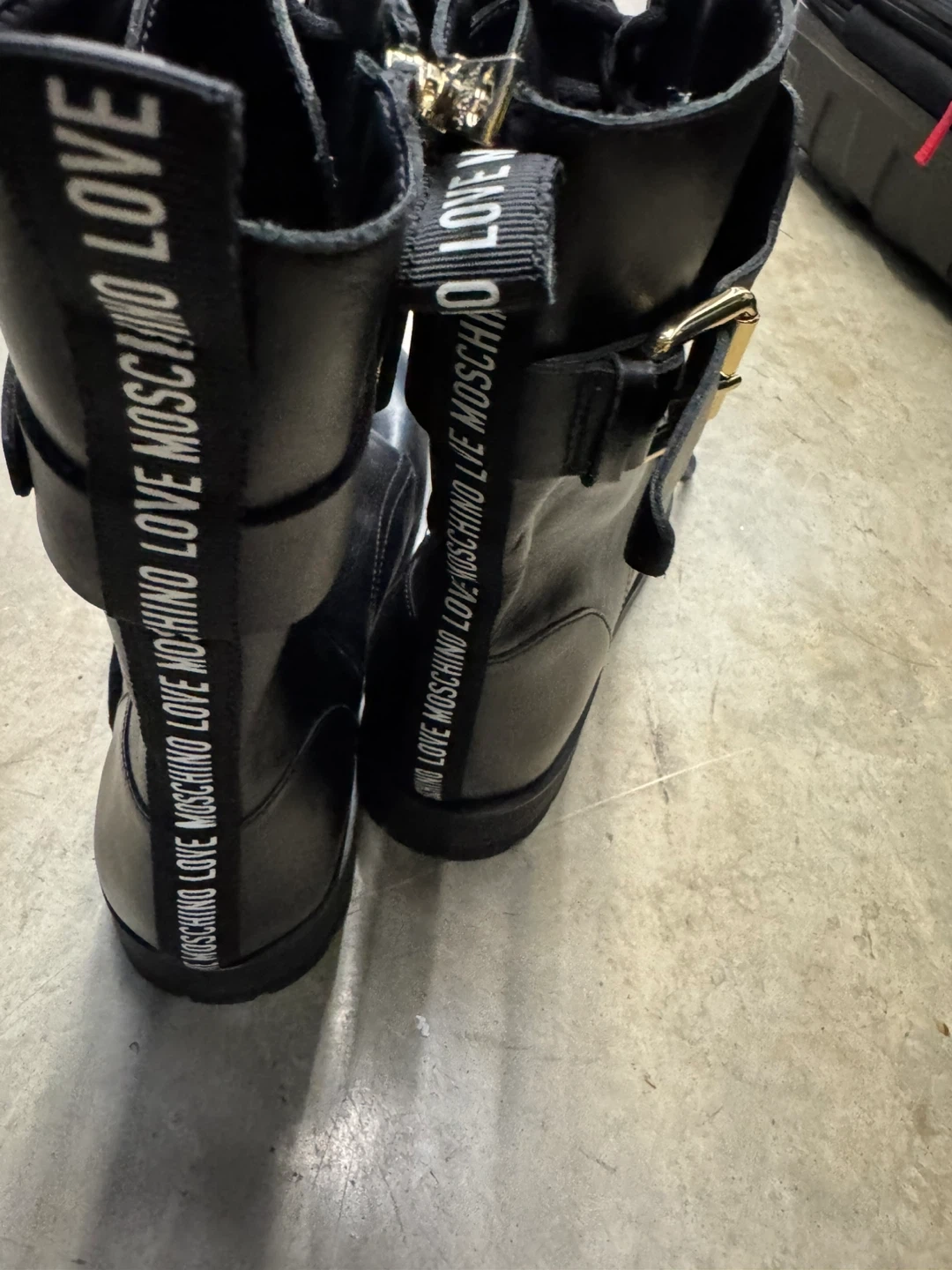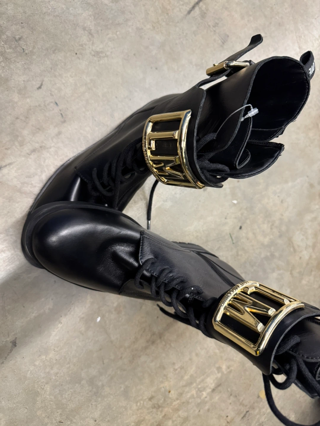 Selling a pair of Love Moschino ankle boots in black leather. They feature a distinctive gold-tone logo buckle and lace-up closure. The brand name is printed on the back strap. Great for adding a stylish edge to any outfit!