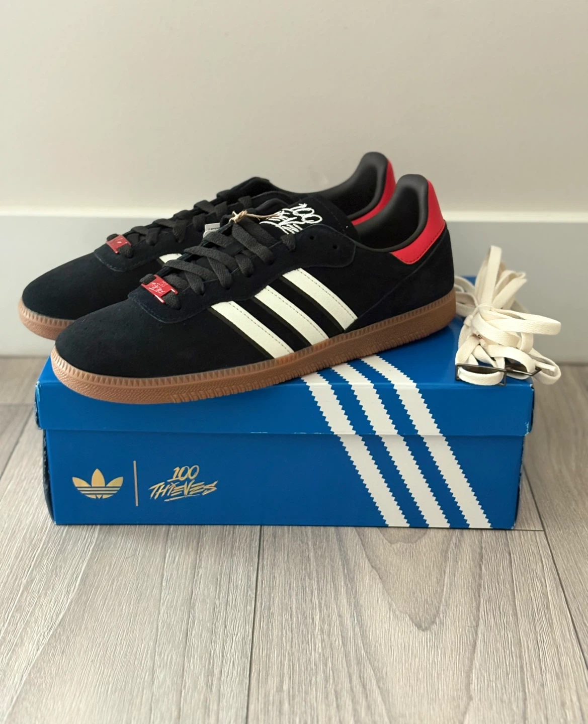 Selling a brand new pair of Adidas x 100 Thieves Samba shoes! These are in excellent condition and come with the original box. The shoes feature the classic Samba silhouette with the iconic three stripes. A great addition to any sneaker collection!