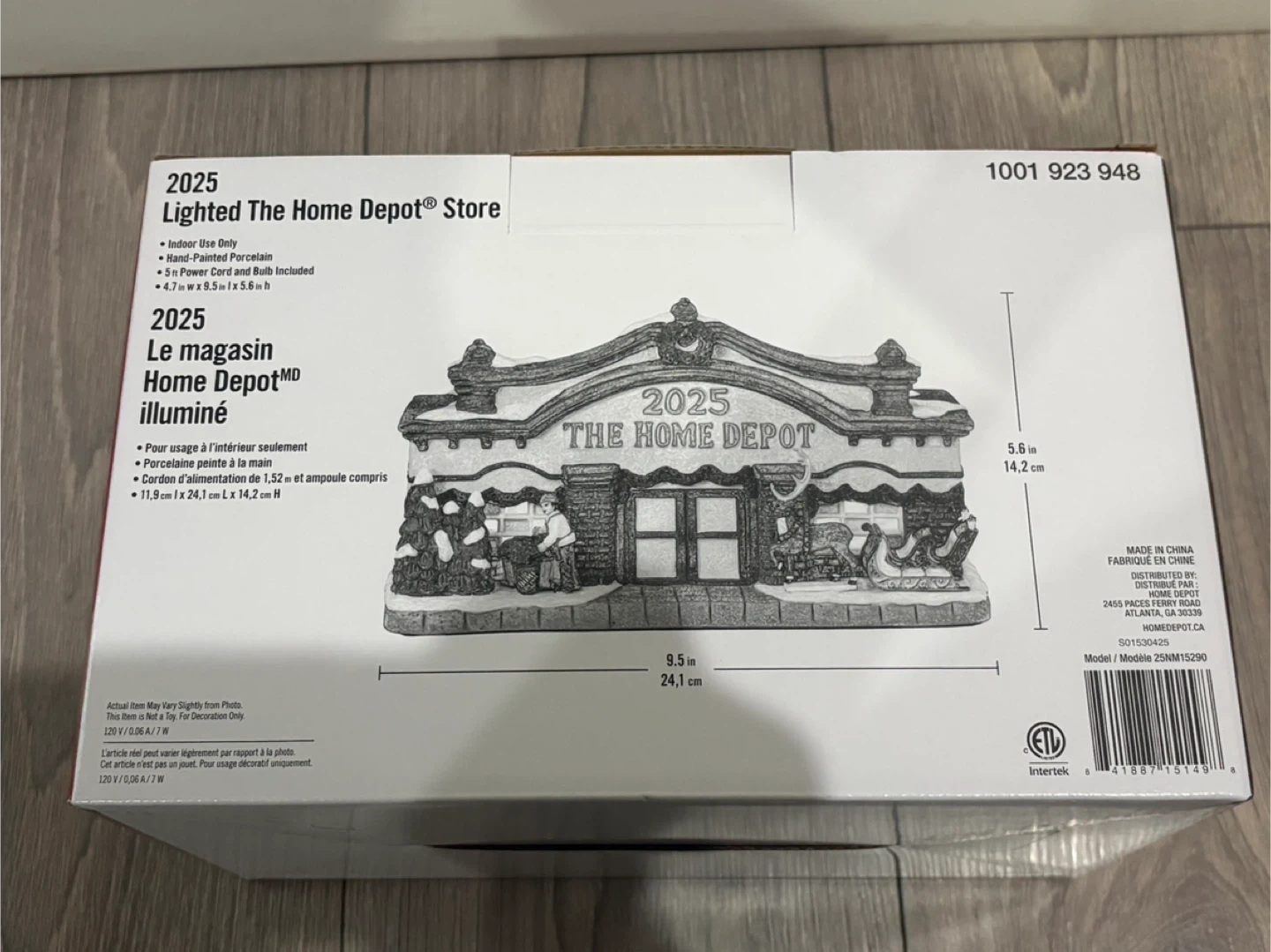 Selling a brand new Home Accents Holiday 2025 Lighted The Home Depot Store. It's porcelain and comes with a 5 ft power cord and bulb included. The dimensions are 4.7 in x 9.5 in x 5.6 in. It's for indoor use only and comes in the original box!