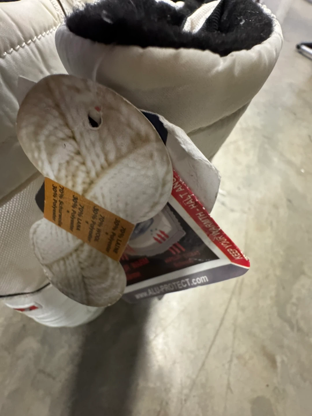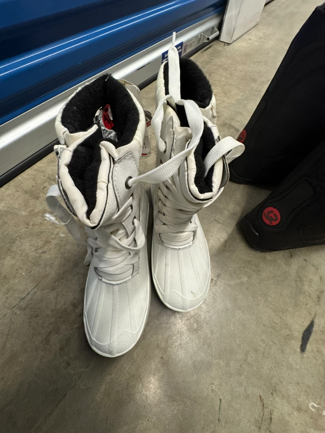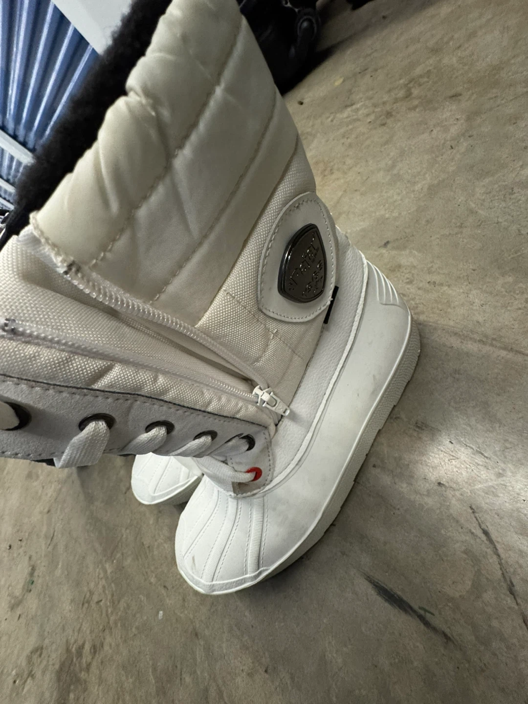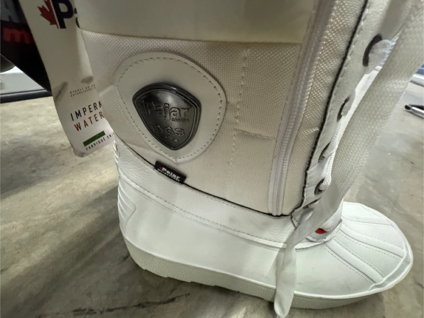 Selling a pair of Pajar Canada Imperia waterproof winter boots in size 10. These boots are white and made with 70% wool and 30% polyester to keep your feet warm and dry during the winter months! They feature a zipper closure and lace-up design.
