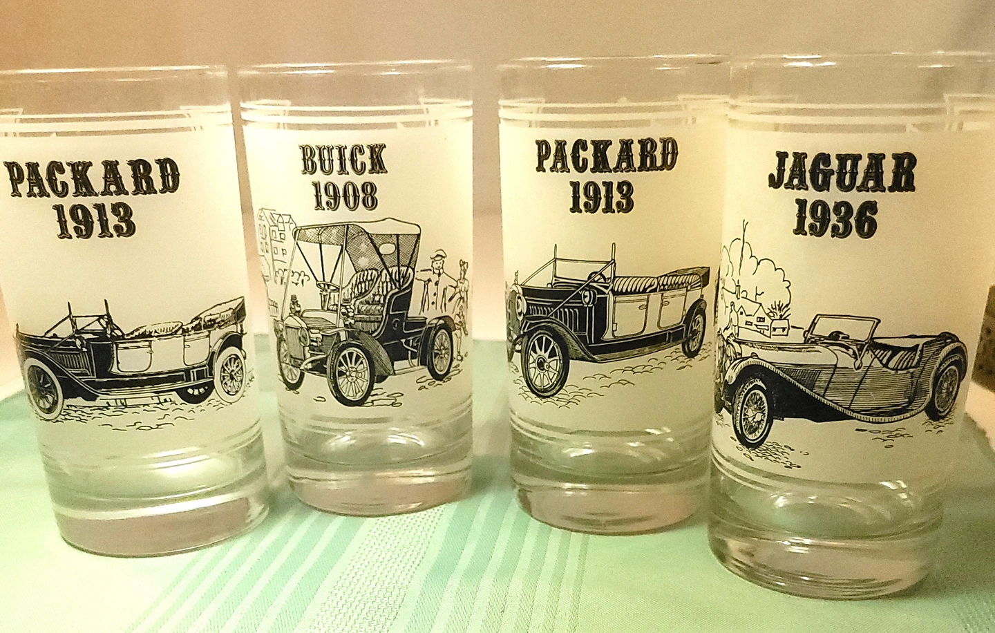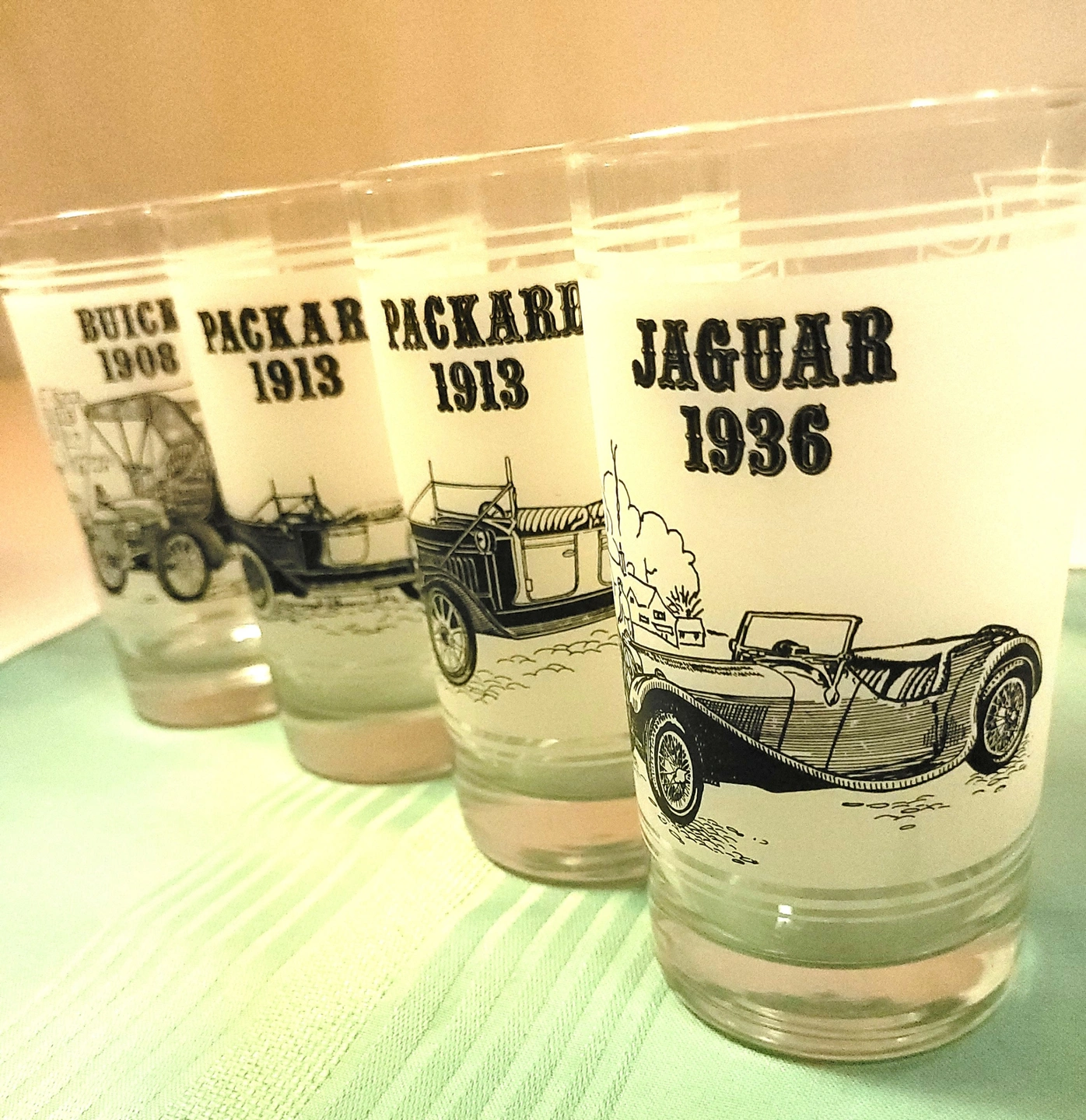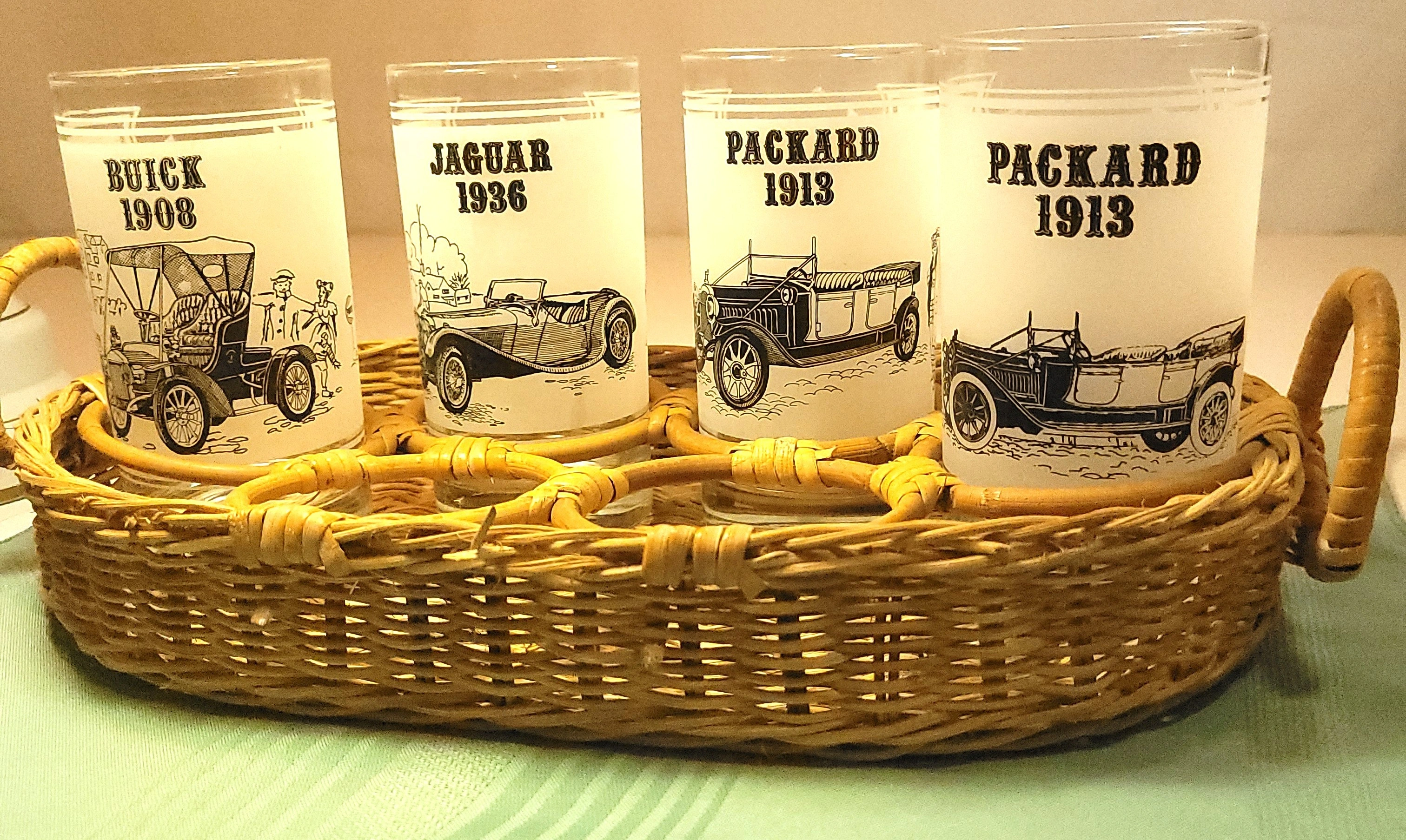 Condition: The set is in good vintage condition with light wear. The glass frosting remains consistent and the black car decals are sharp and vibrant. The woven rattan caddy is structurally sound with no major breaks or unraveling to the natural fibers. Hand wash only recommended. Please reference photos as part of the description of the item.