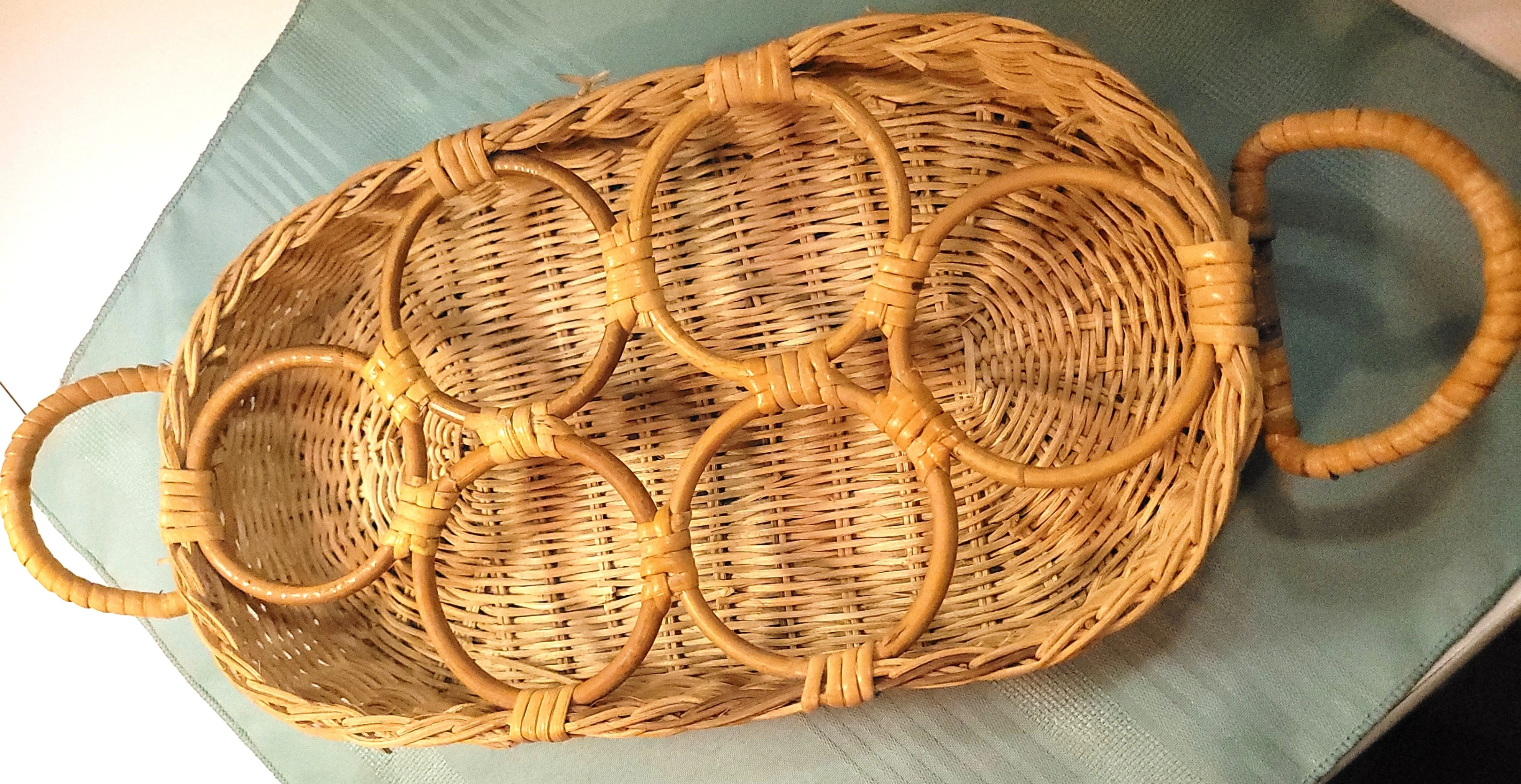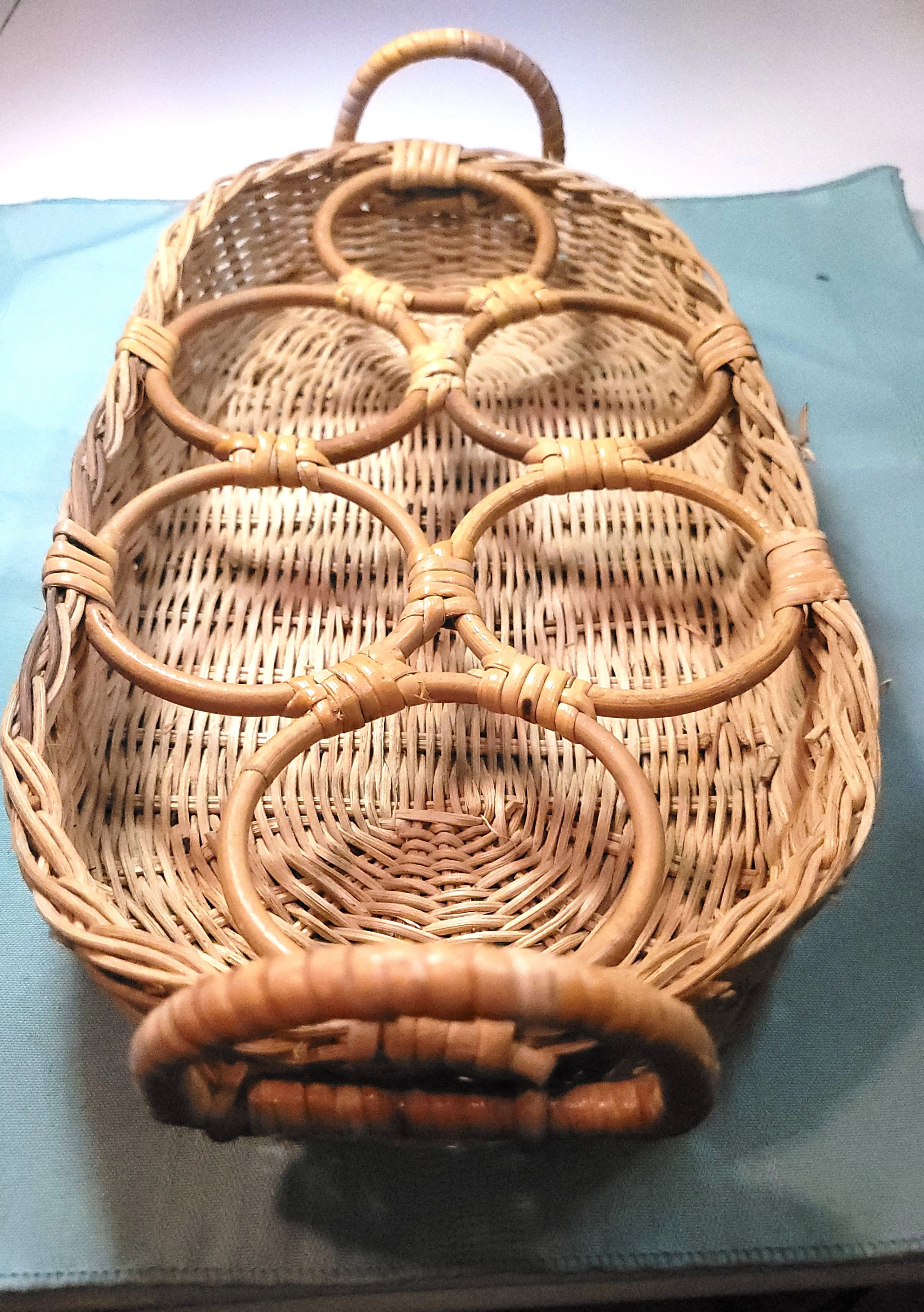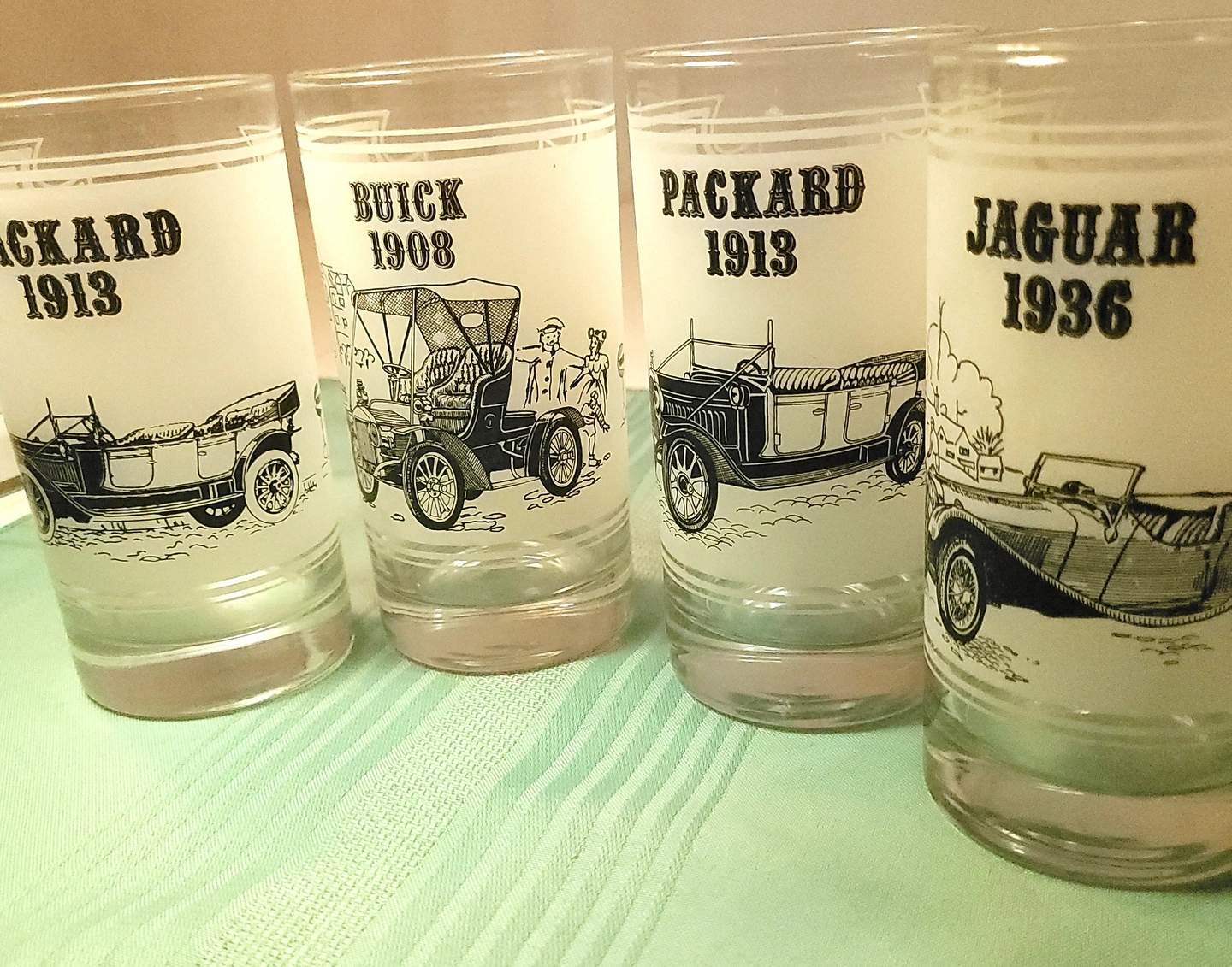 Condition: The set is in good vintage condition with light wear. The glass frosting remains consistent and the black car decals are sharp and vibrant. The woven rattan caddy is structurally sound with no major breaks or unraveling to the natural fibers. Hand wash only recommended. Please reference photos as part of the description of the item.