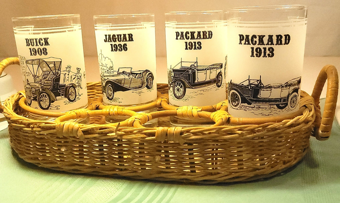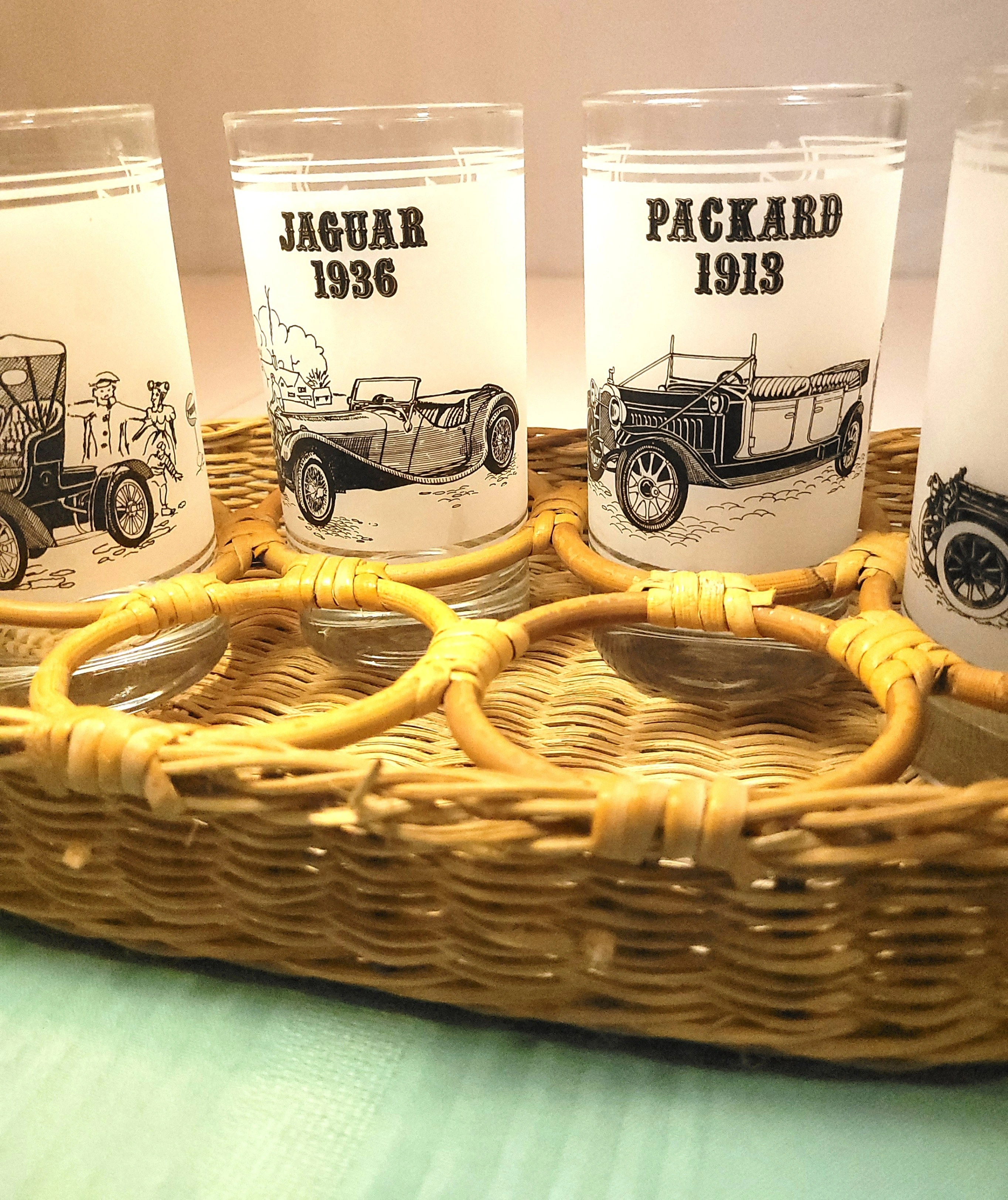 A stunning example of Mid-Century Modern barware both from the 1950s. This set features four frosted highball glasses by the Hazel-Atlas Glass Co. (USA), decorated with crisp black illustrations of legendary early automobiles. The set is housed in its period-correct hand-woven rattan carrying caddy.