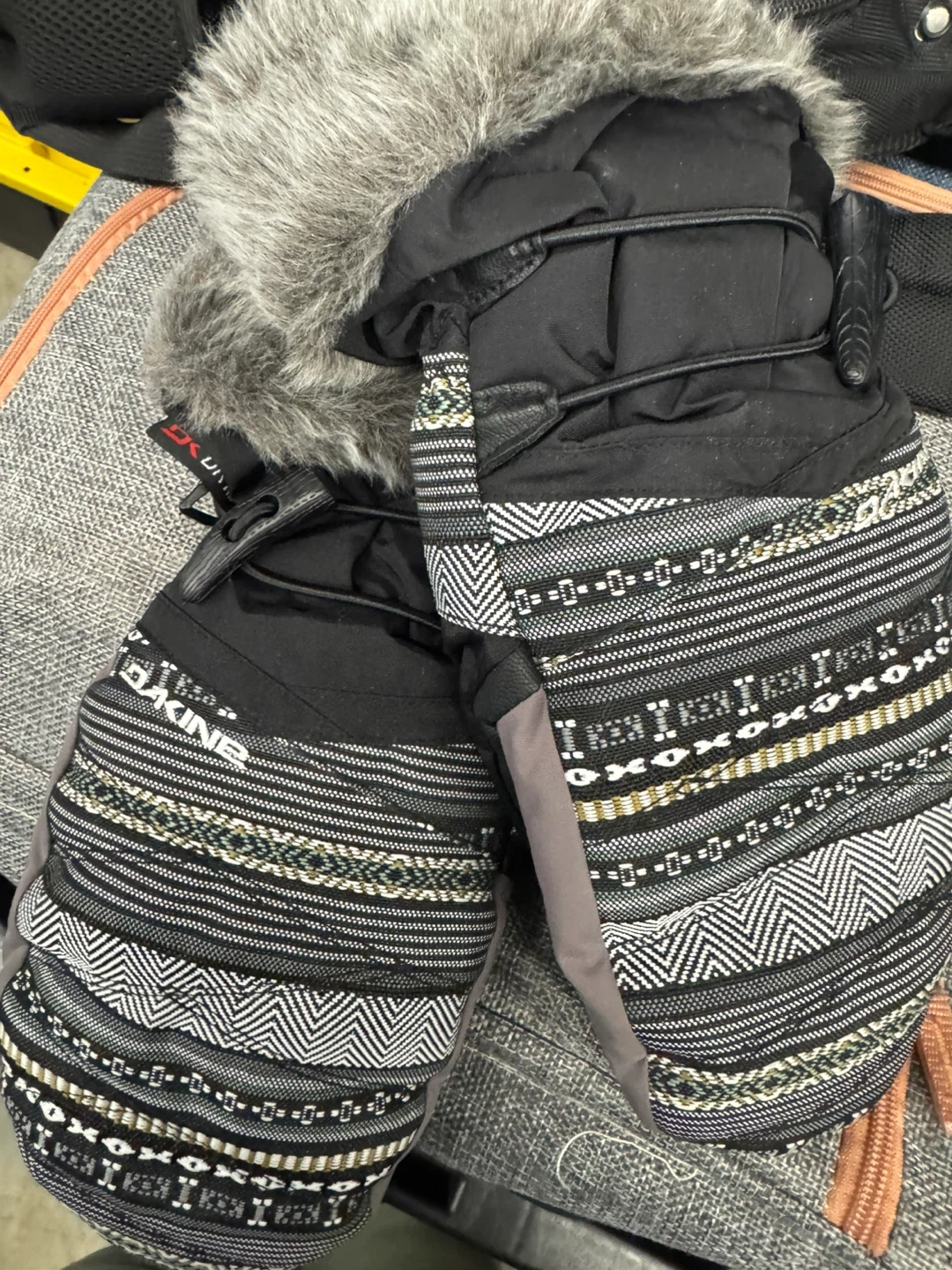 Here are some Dakine mittens in a black patterned design! They are a size large and look to be in great condition, ready to keep your hands warm on the slopes or during the winter season