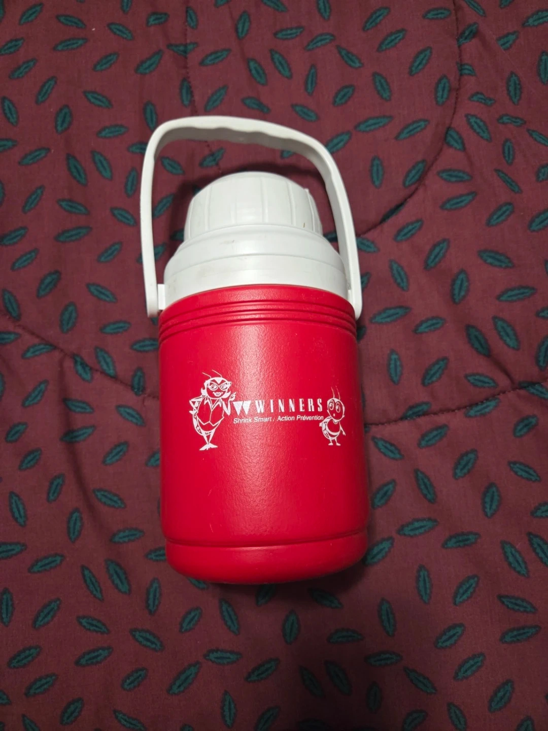 Insulated beverage jug with lid and carry handle.