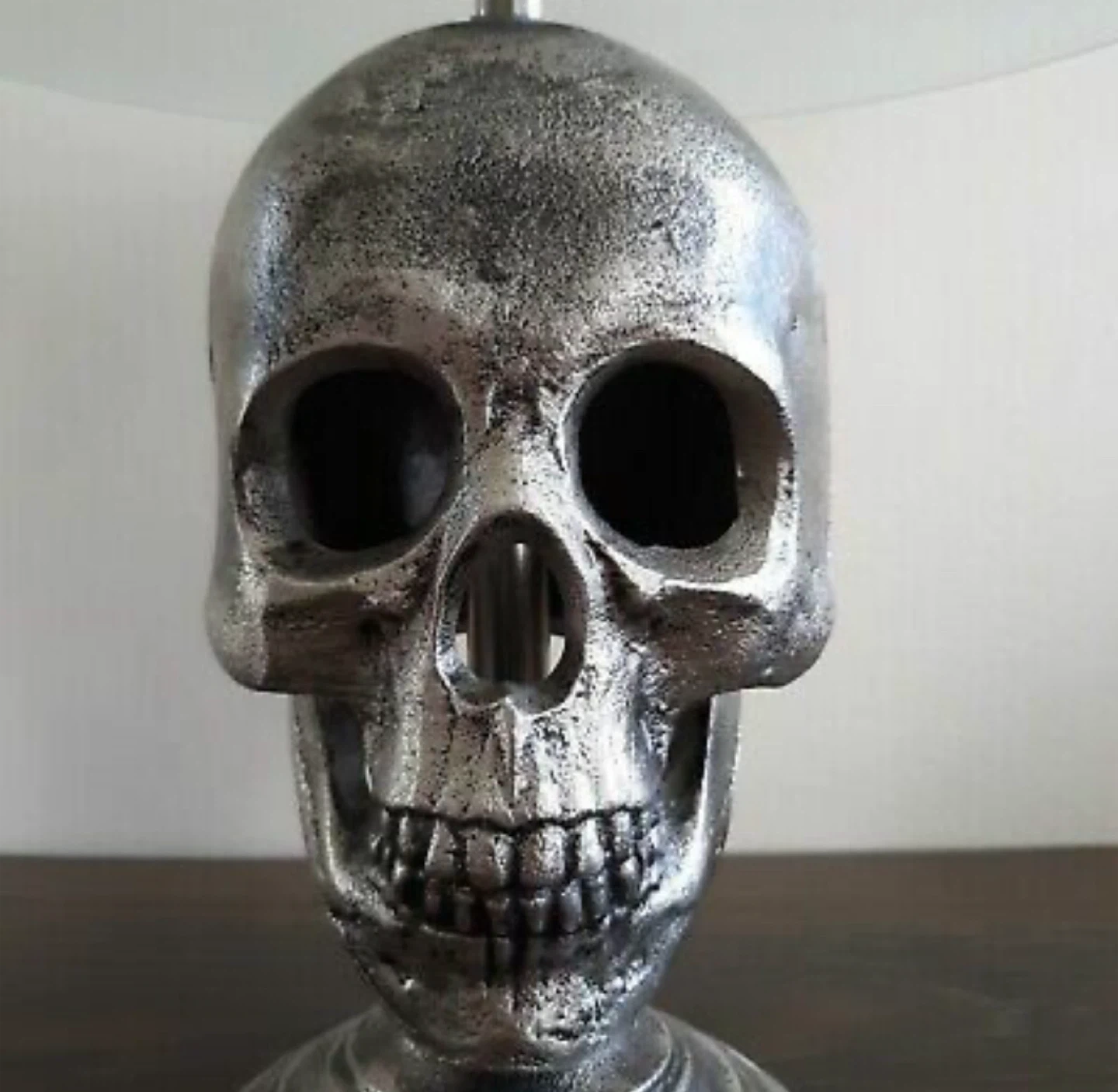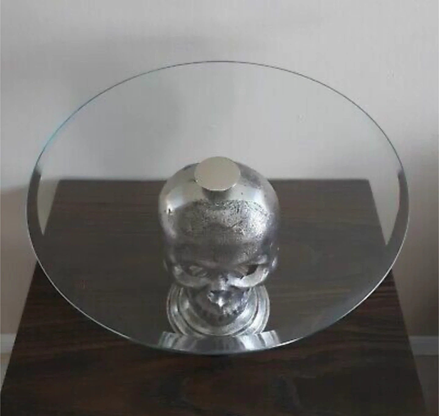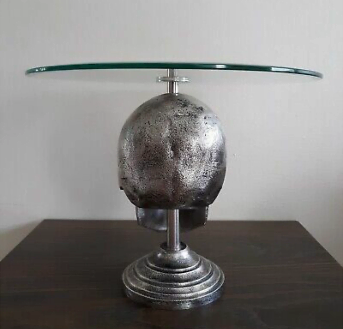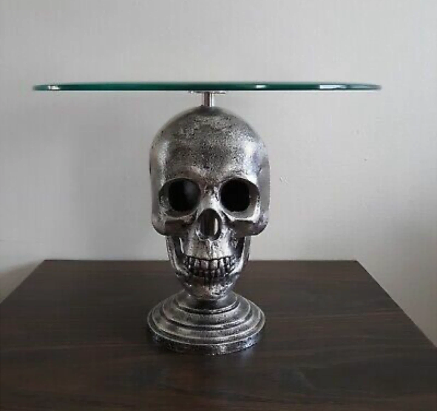 Total height is approximately 9 1/2 inches, the glass top is 12 inches round & the skull is 7 inches tall. It weighs approximately 5 pounds. The skull is made of metal on a metal base. The platter is beveled glass supported by a metal rod. It is a good quality stable, solid piece. It is in excellent clean condition with no chips on the glass.