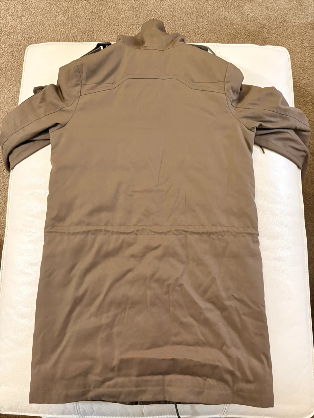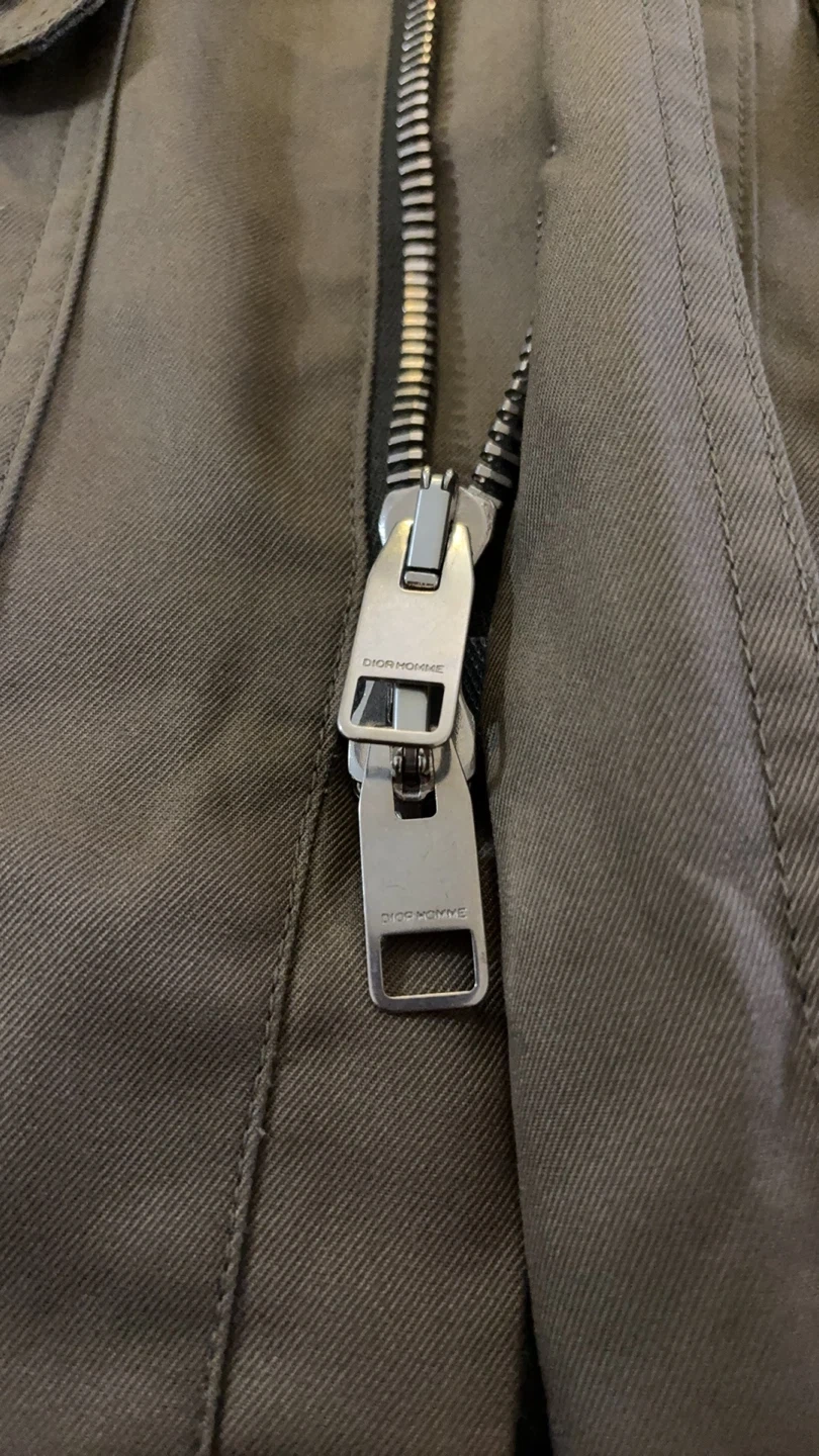 Selling a Dior Homme jacket in an olive green colour. The jacket features a zipper with Dior Homme branding, as well as branded buttons. It has a hood and several pockets.