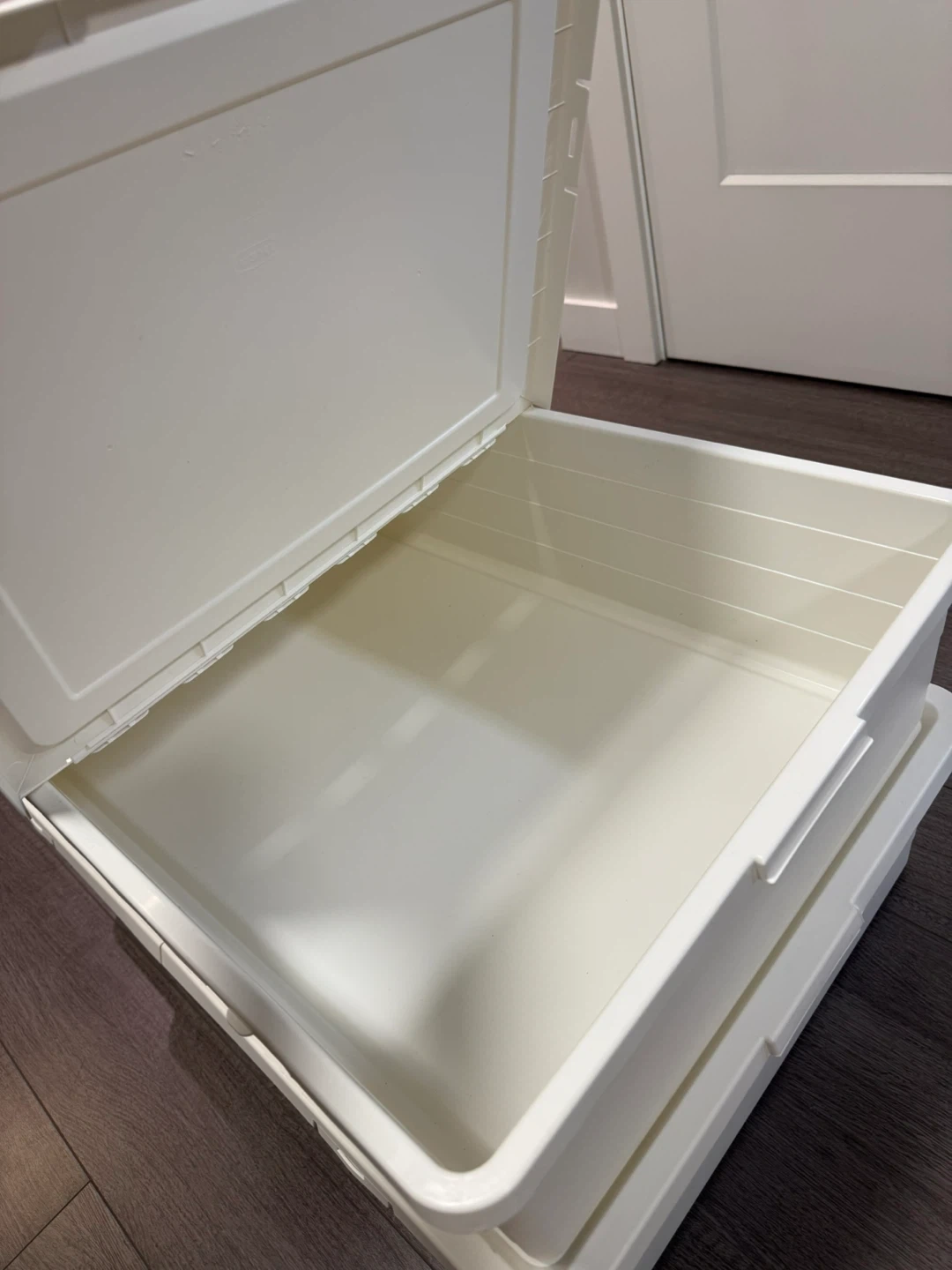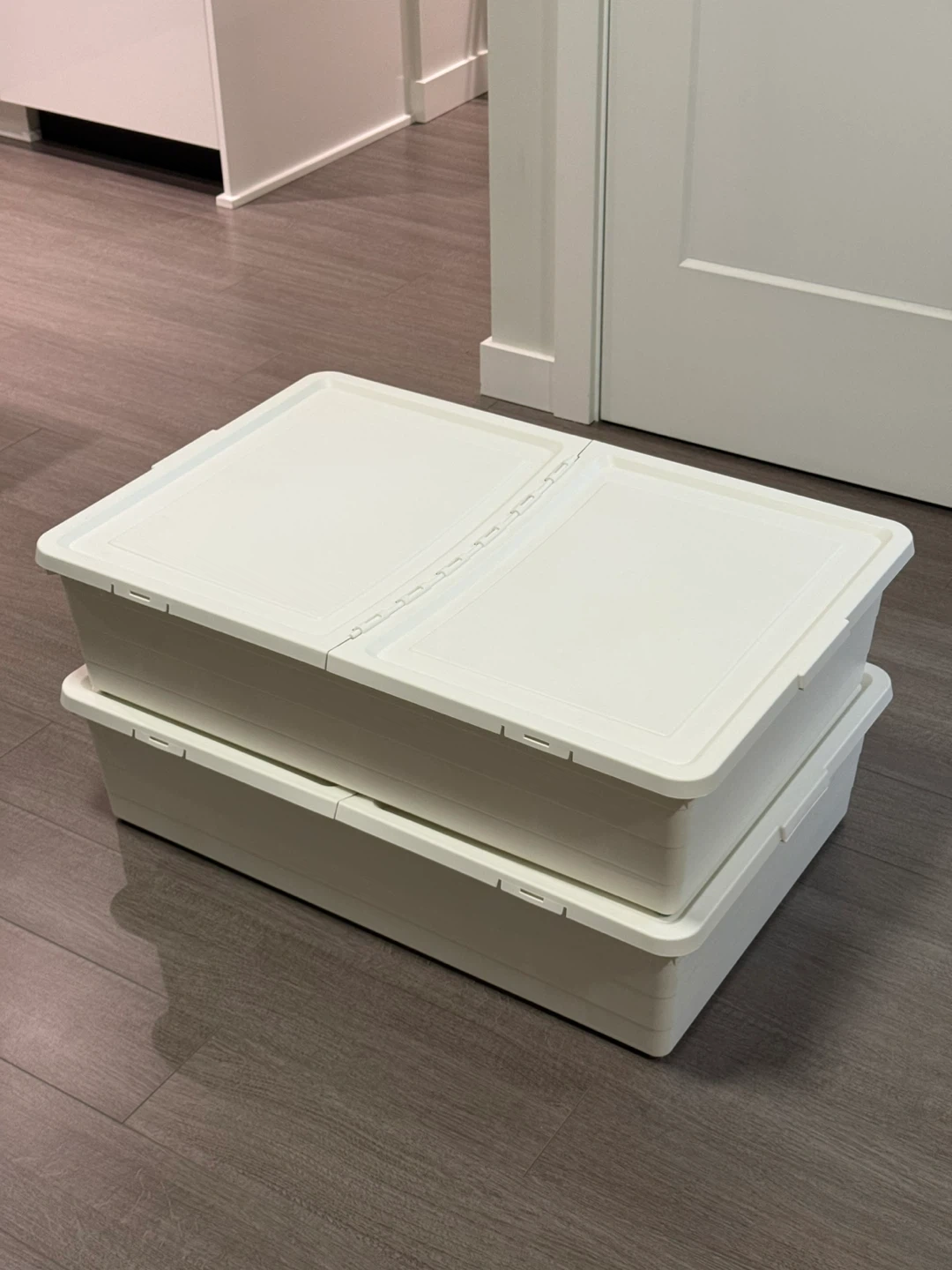 Selling a set of two IKEA SOCKERBIT storage boxes with lids in white. They measure 50x77x19 cm (19 ¾x30 ¼x7 ½ ").