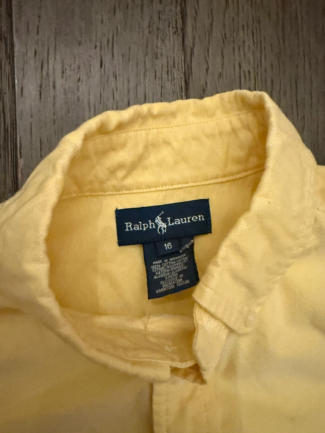 Selling a gently used Ralph Lauren button-up shirt in a cheerful yellow colour. It's a size 16 and made of 100% cotton. Perfect for a casual or dressed-up look!