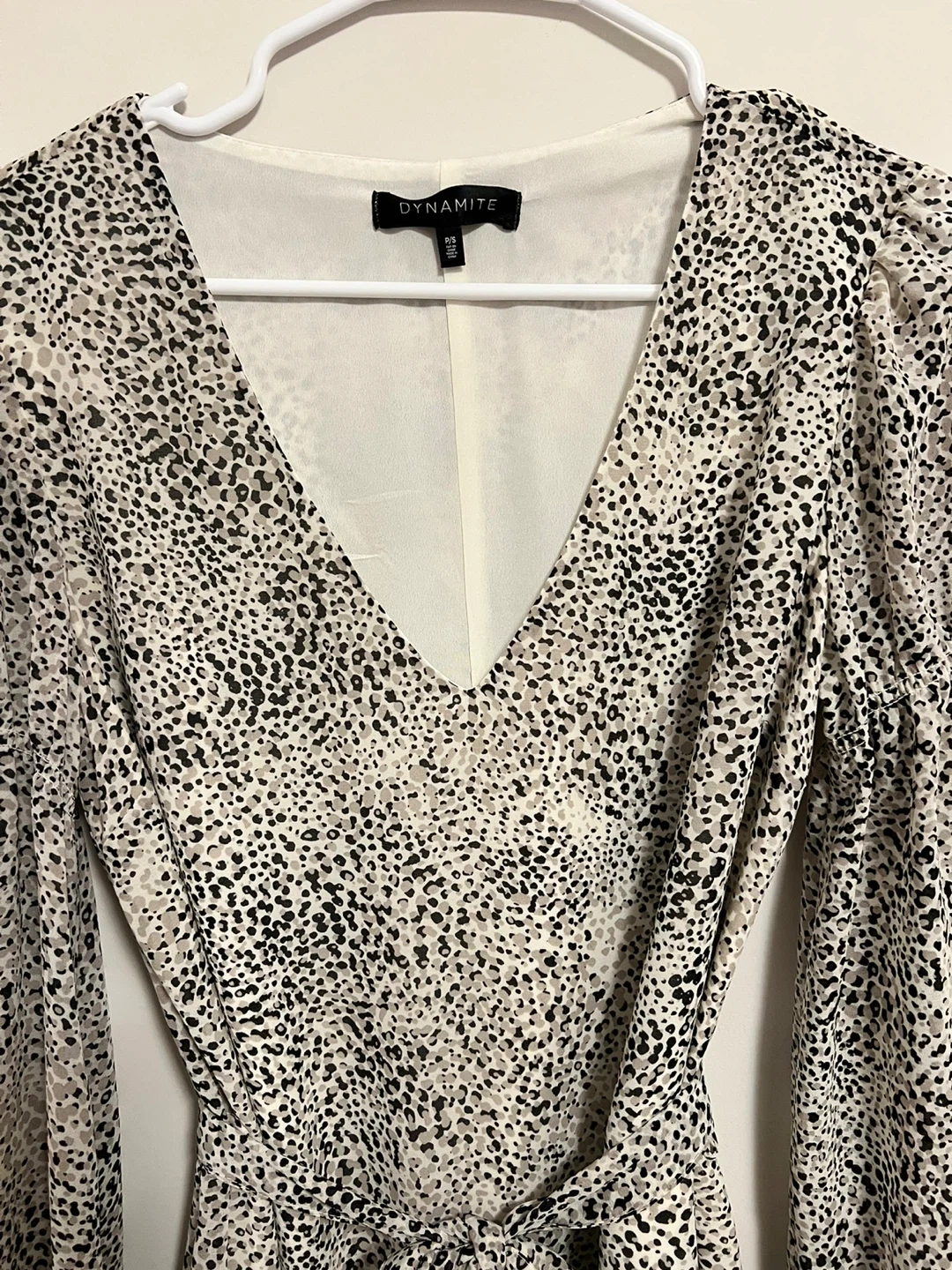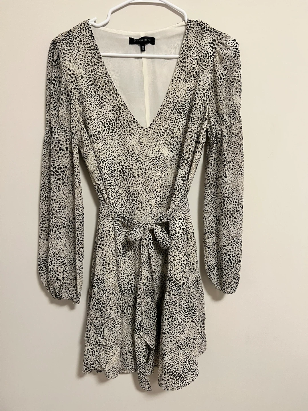Selling a cute Dynamite dress in size small. It features a stylish animal print and a flattering V-neck design. Perfect for a night out or a special occasion