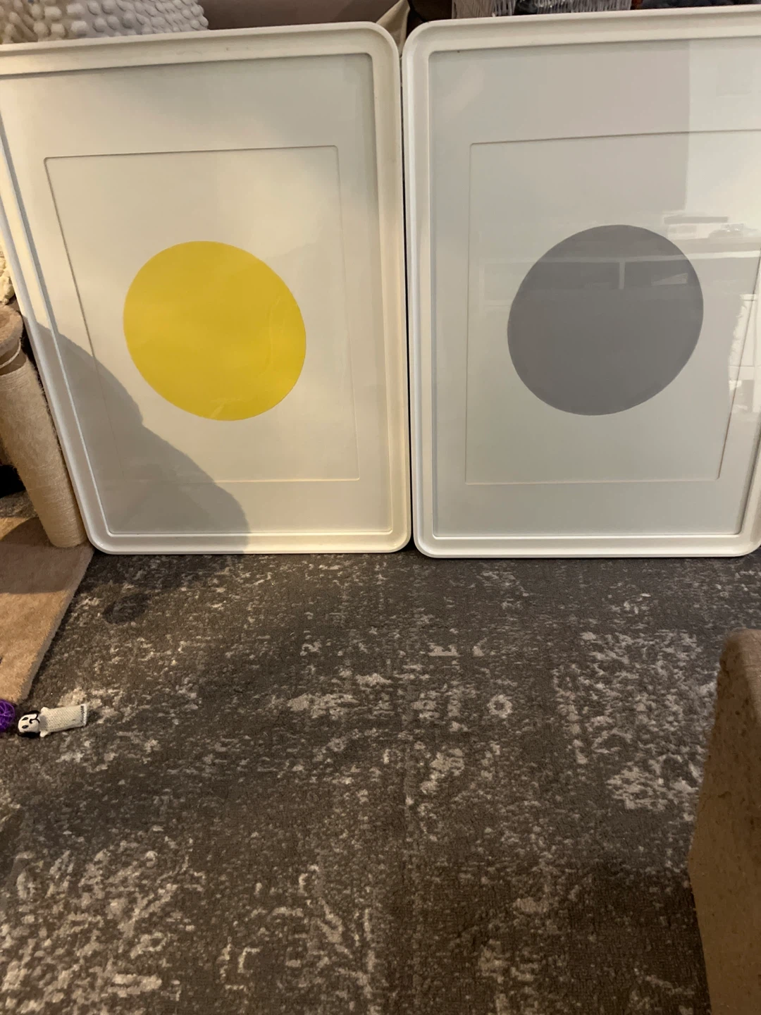 Two framed prints featuring simple circle designs! One is a sunny yellow, and the other is a sleek grey. They'd be a great addition to any room looking for a modern touch. Too large and heavy for me to put up… They are a bit heavy. Width is approx 22 inches length is 29infhes and depth is 2 inches .