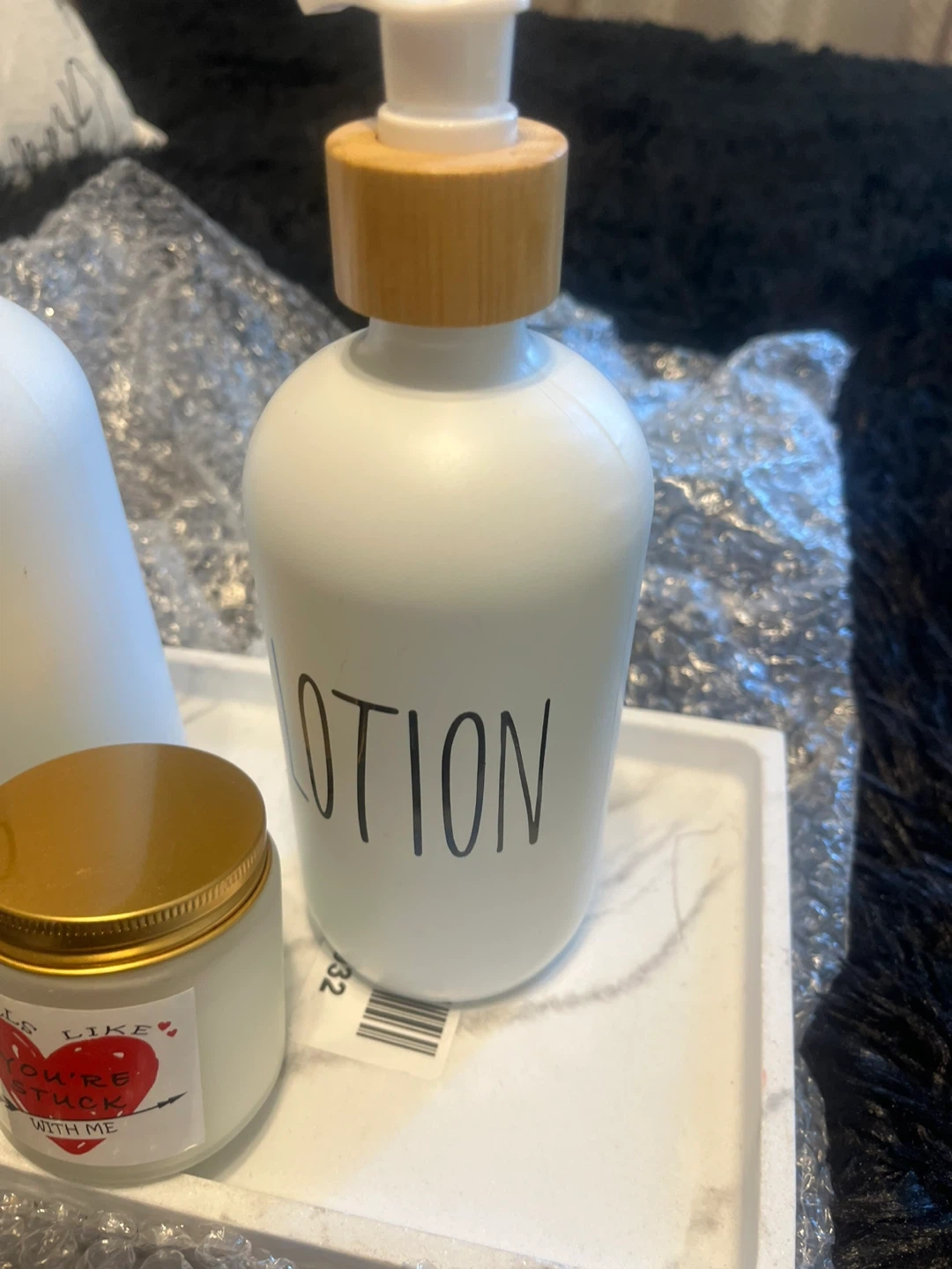 Selling a set of soap and lotion dispensers, complete with a matching tray! These are in great shape and would look lovely in any bathroom or kitchen. The set also includes a small jar of scented lotion.