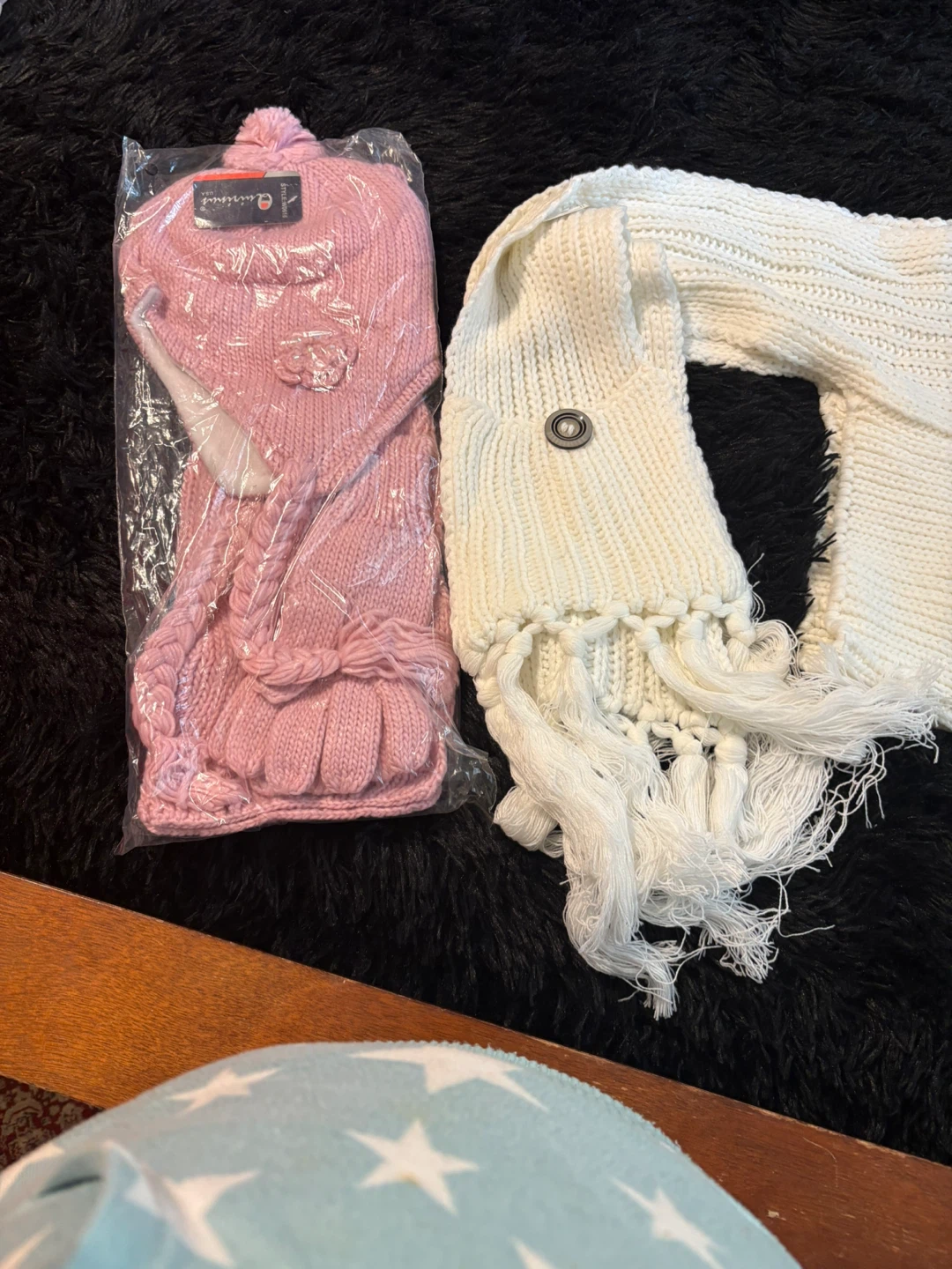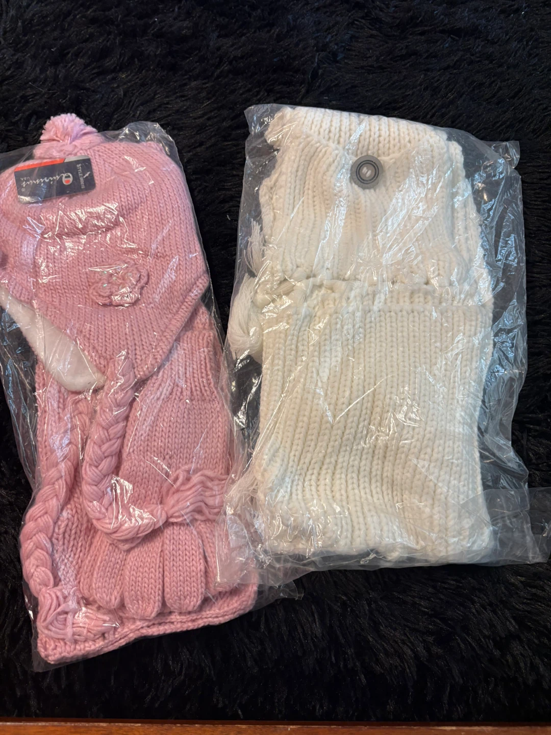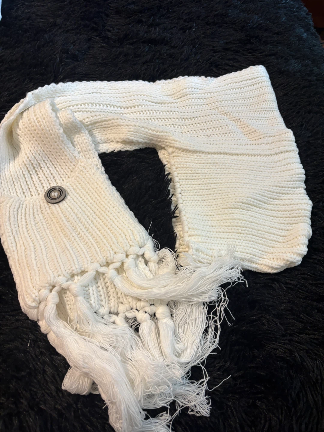 Selling a brand new, white knitted hooded scarf! It's super cozy and stylish, perfect for keeping warm during those chilly Canadian days and nights. The scarf features a hood and cute tassels, adding a bit of flair to your winter wardrobe