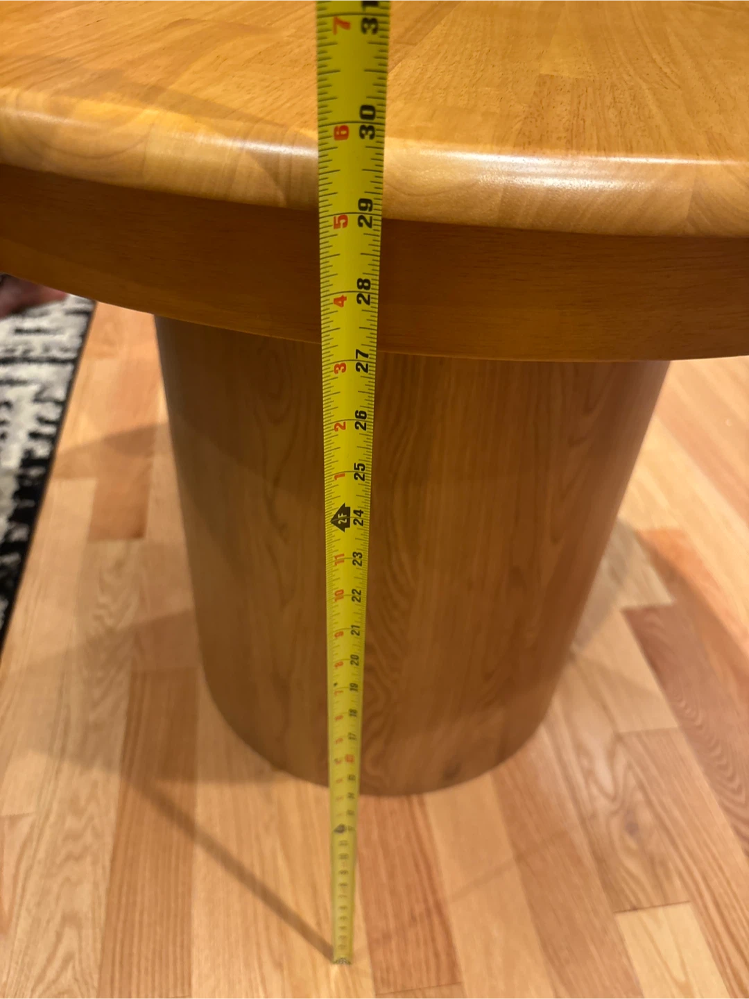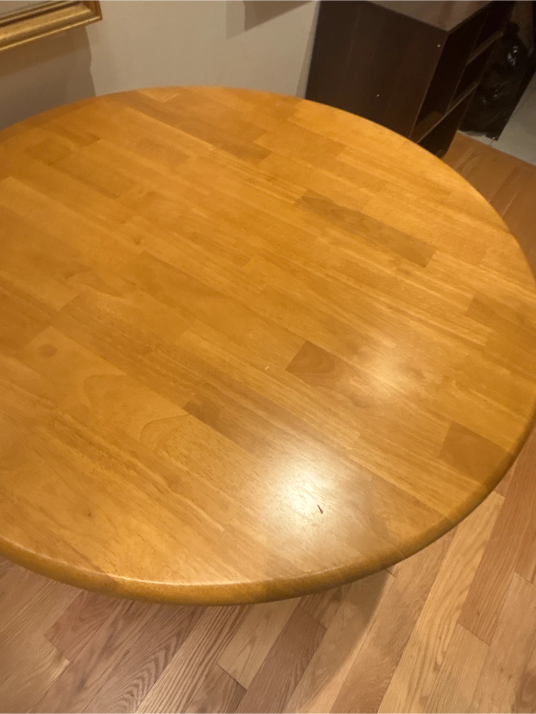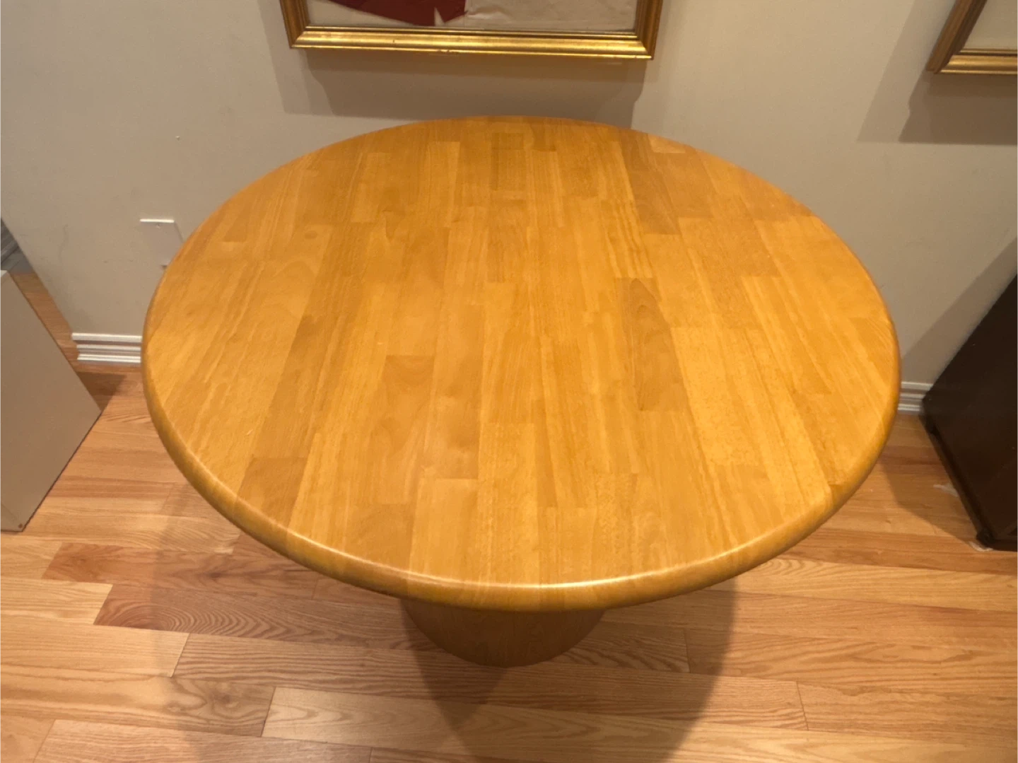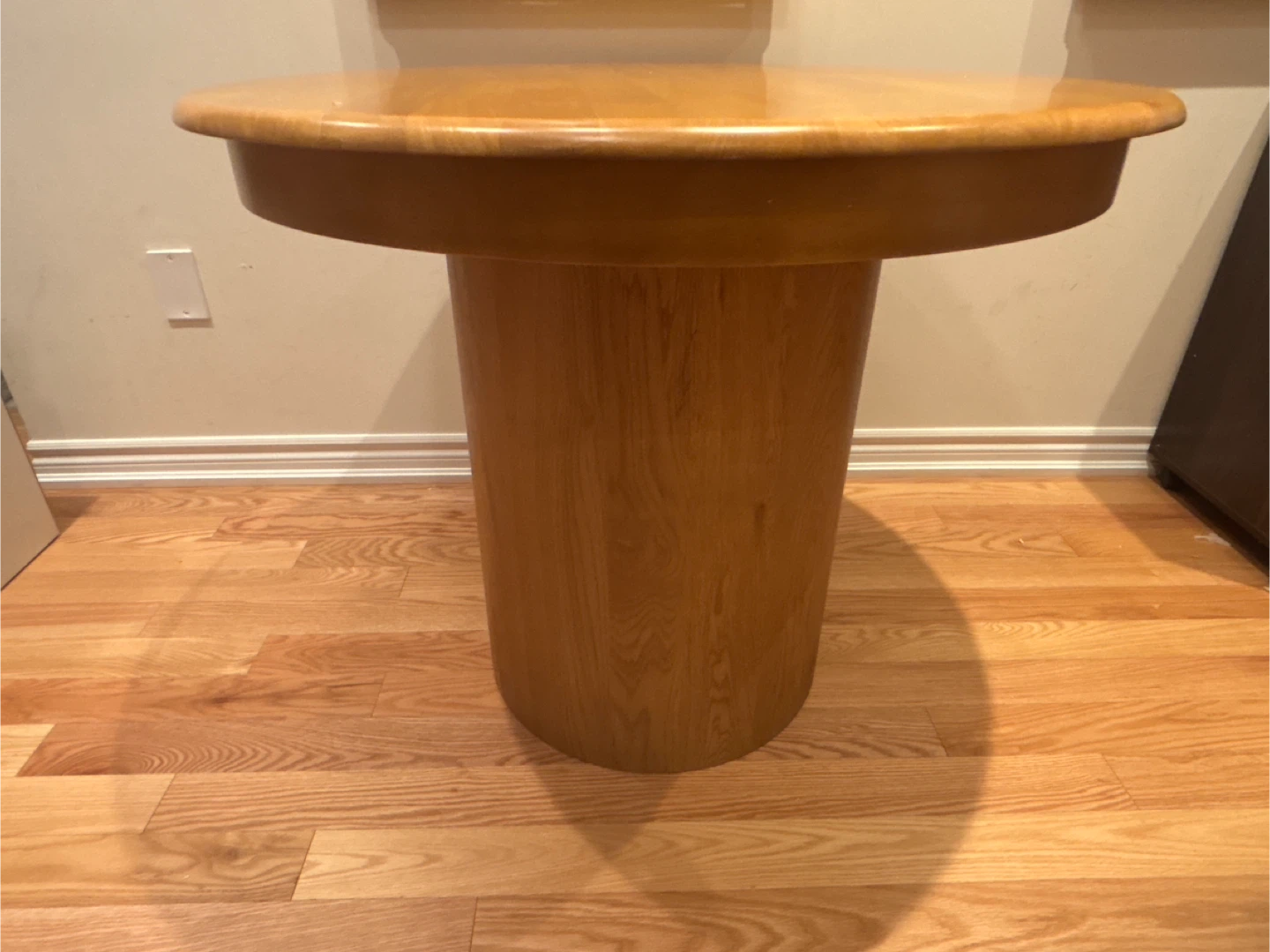 Two Tone Solid Round wooden dining table. The table top measures approximately 35 inches in diameter. It would be a great addition to any dining space.