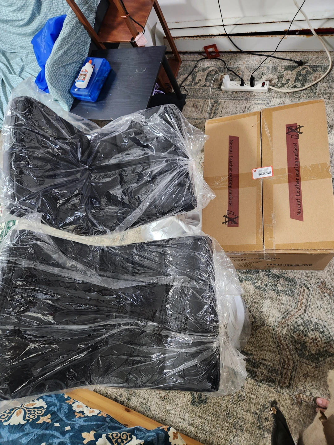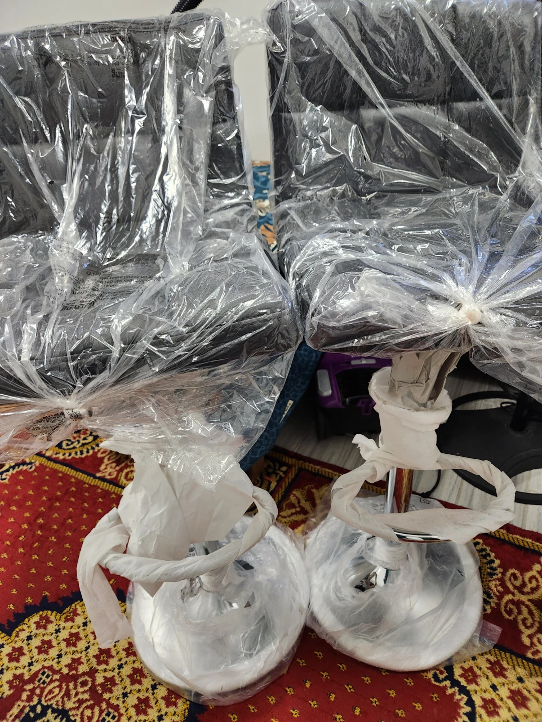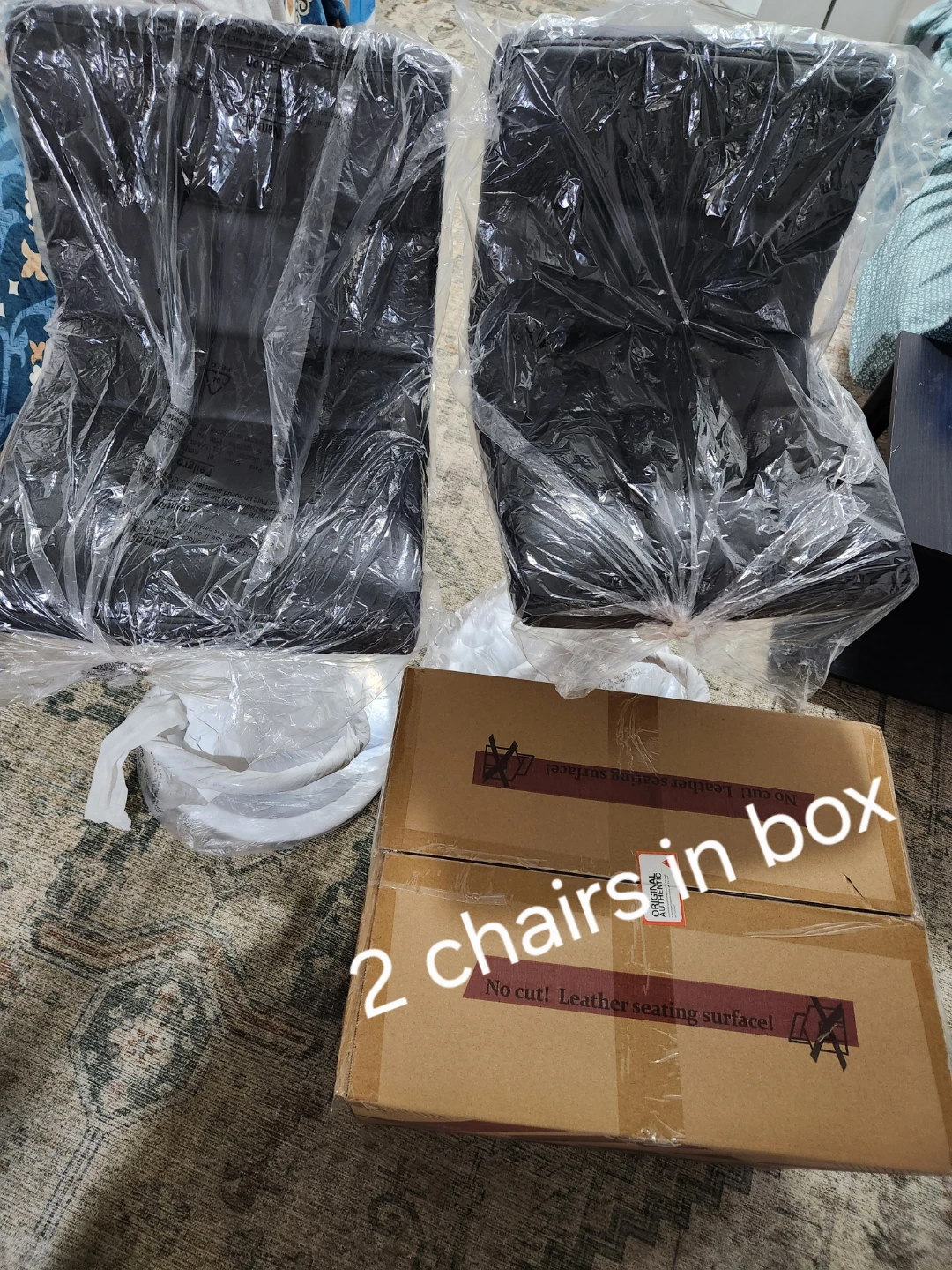 I'm selling a brand new set of two black leather bar stools! They are still in their original packaging and haven't been used. The chairs have a leather seating surface, adding a touch of elegance to your kitchen or bar area. Get this set today!