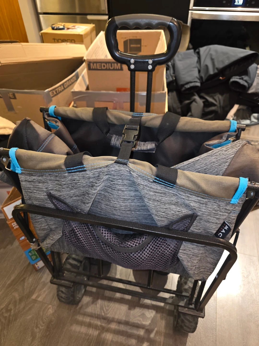 This is a MAC Sports collapsible folding outdoor utility wagon. It's great for carrying groceries, camping gear, or anything else you need to haul around. It has a sturdy frame and durable fabric, making it perfect for outdoor use