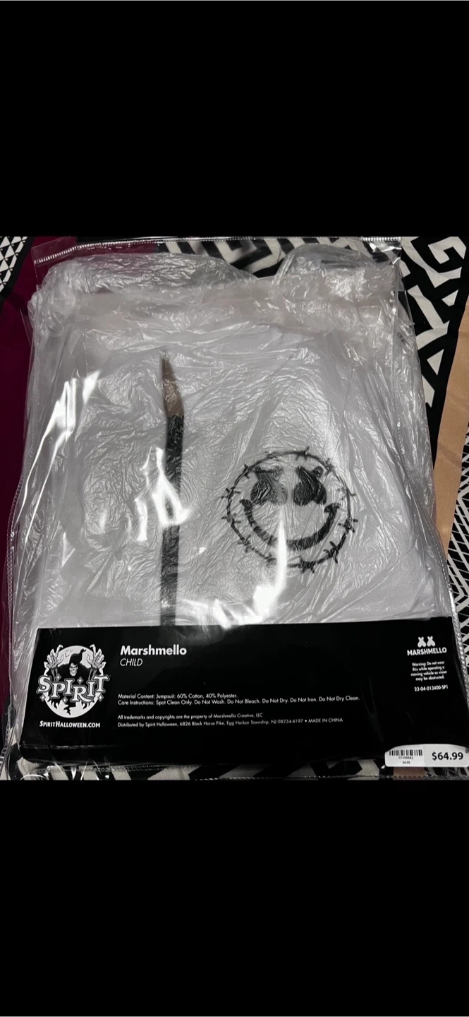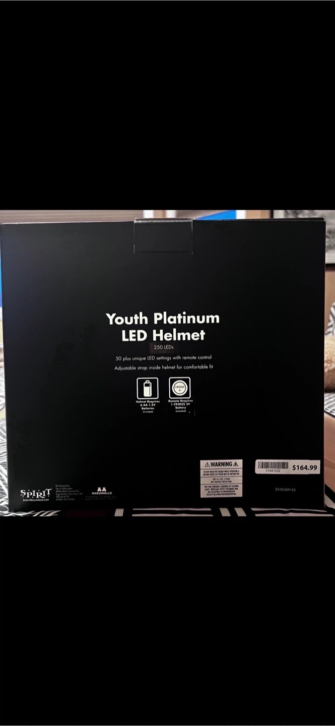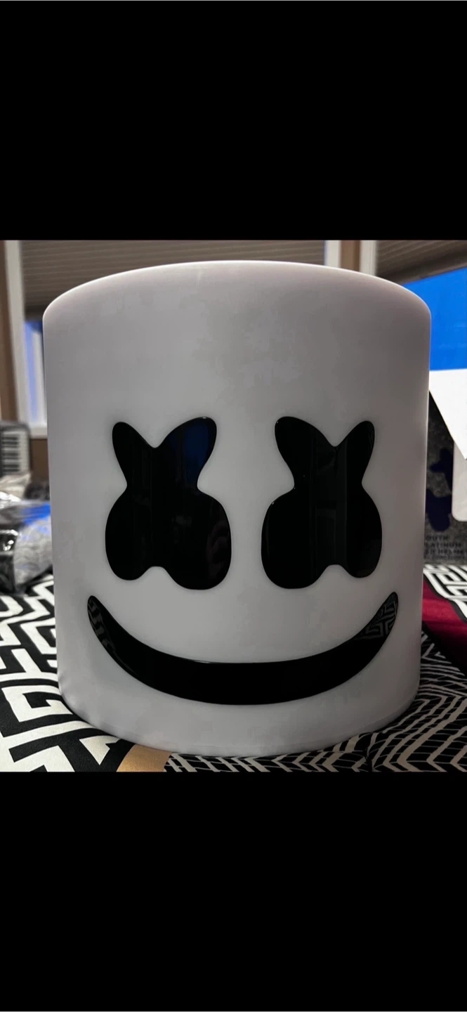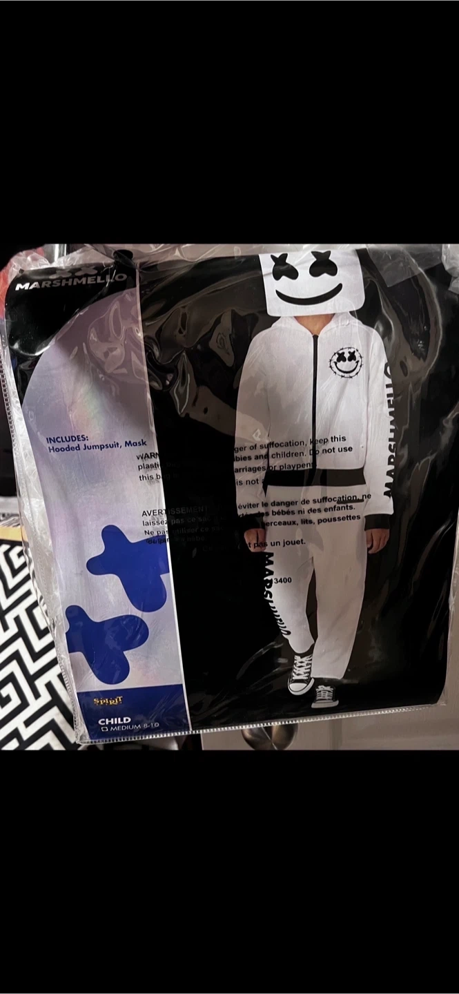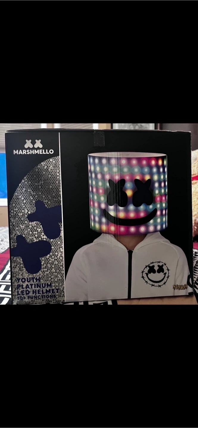 Selling a Marshmello Youth Platinum LED Helmet, which has 50+ unique LED settings with remote control. Also included is a Marshmello child costume. Both items come in their original boxes. The costume is size child medium 8-10.