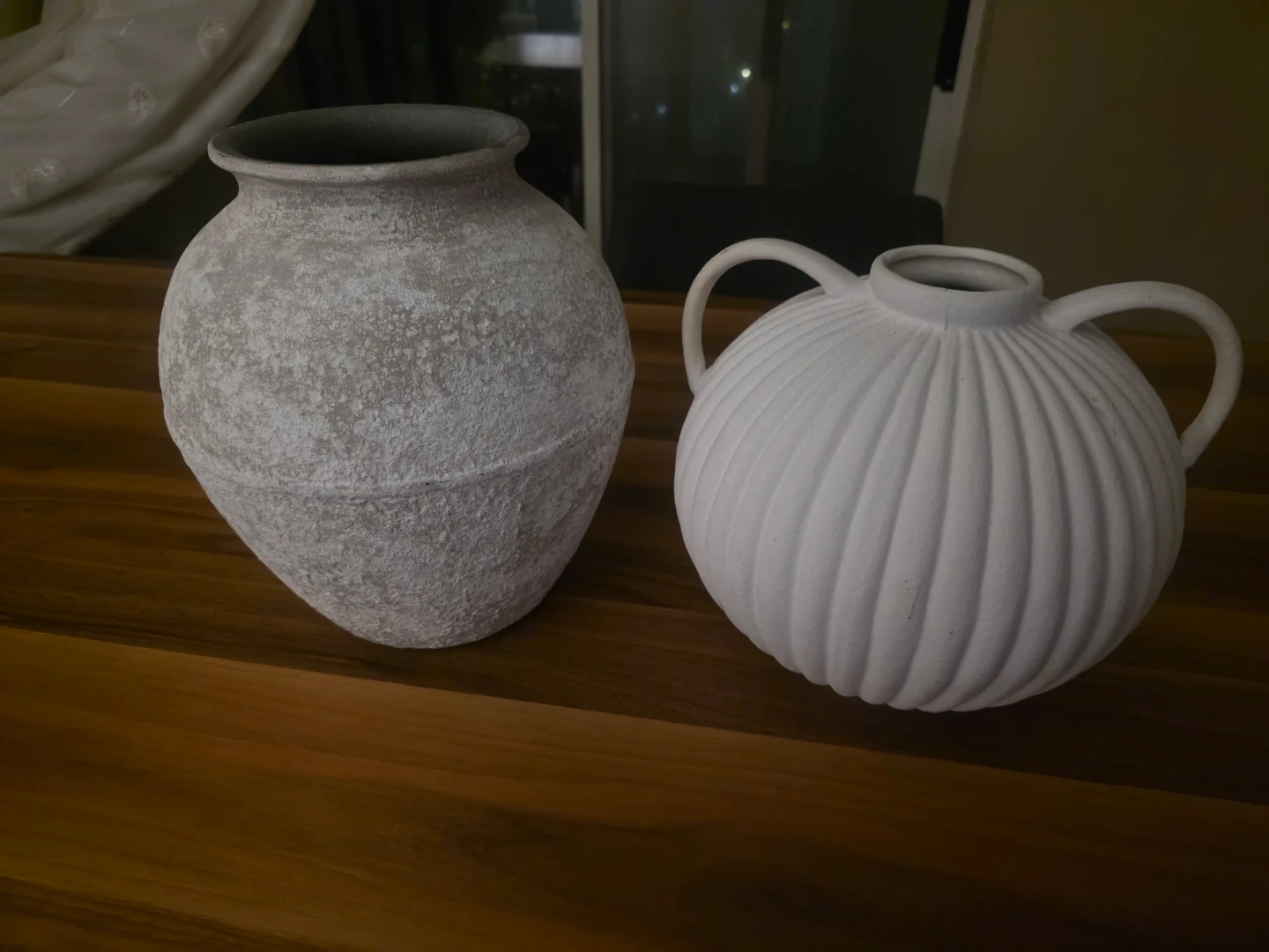 Selling two decorative vases. One is a textured grey colour, and the other is white with a ribbed design and handles. They would look great in any home!