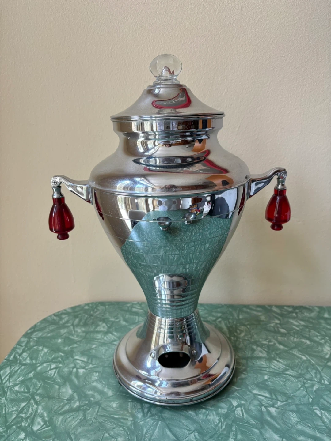 Selling a vintage chrome coffee percolator set, including the main dispenser, a sugar bowl, and a creamer. The dispenser stands approximately 15 inches tall. The sugar bowl and creamer are about 4 inches in diameter. This set would be a great addition to any vintage kitchen collection! Bakelite handles!
