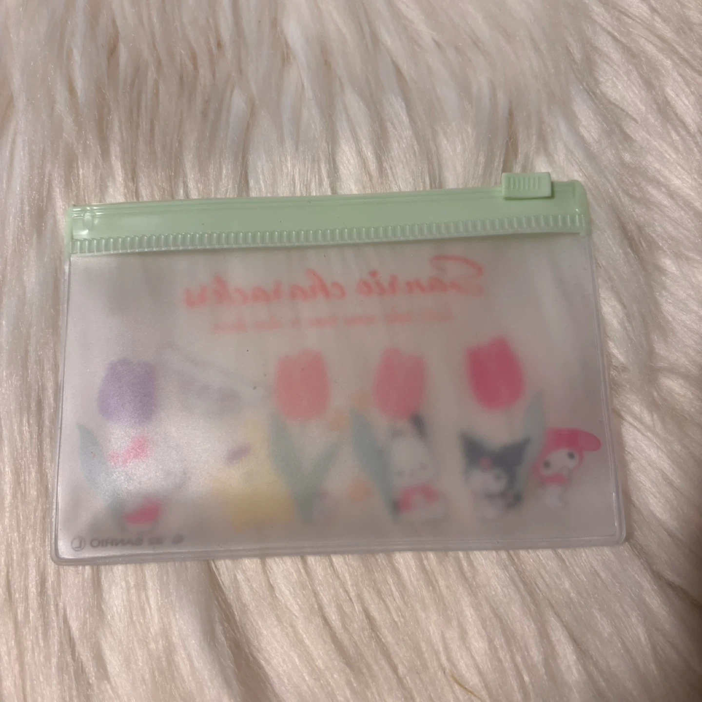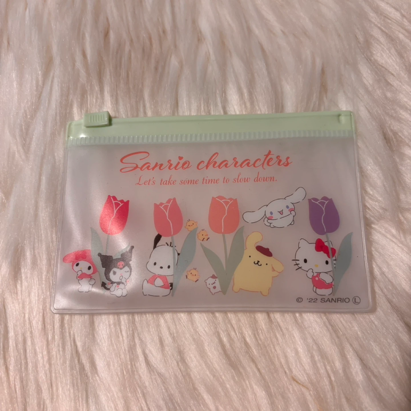 Here's a cute Sanrio Characters pouch! It has a zipper and is perfect for storing small items. It features various Sanrio characters and a floral design. Great for adding a touch of kawaii to your daily life