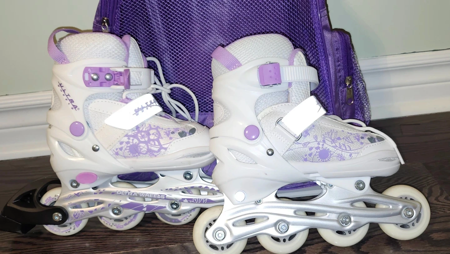 Get ready to roll with this Ultra Wheels roller skate set! It comes with a handy purple backpack to keep everything together. The set also includes knee and wrist pads for extra safety while you're skating. Perfect for beginners or anyone looking to enjoy some outdoor fun!