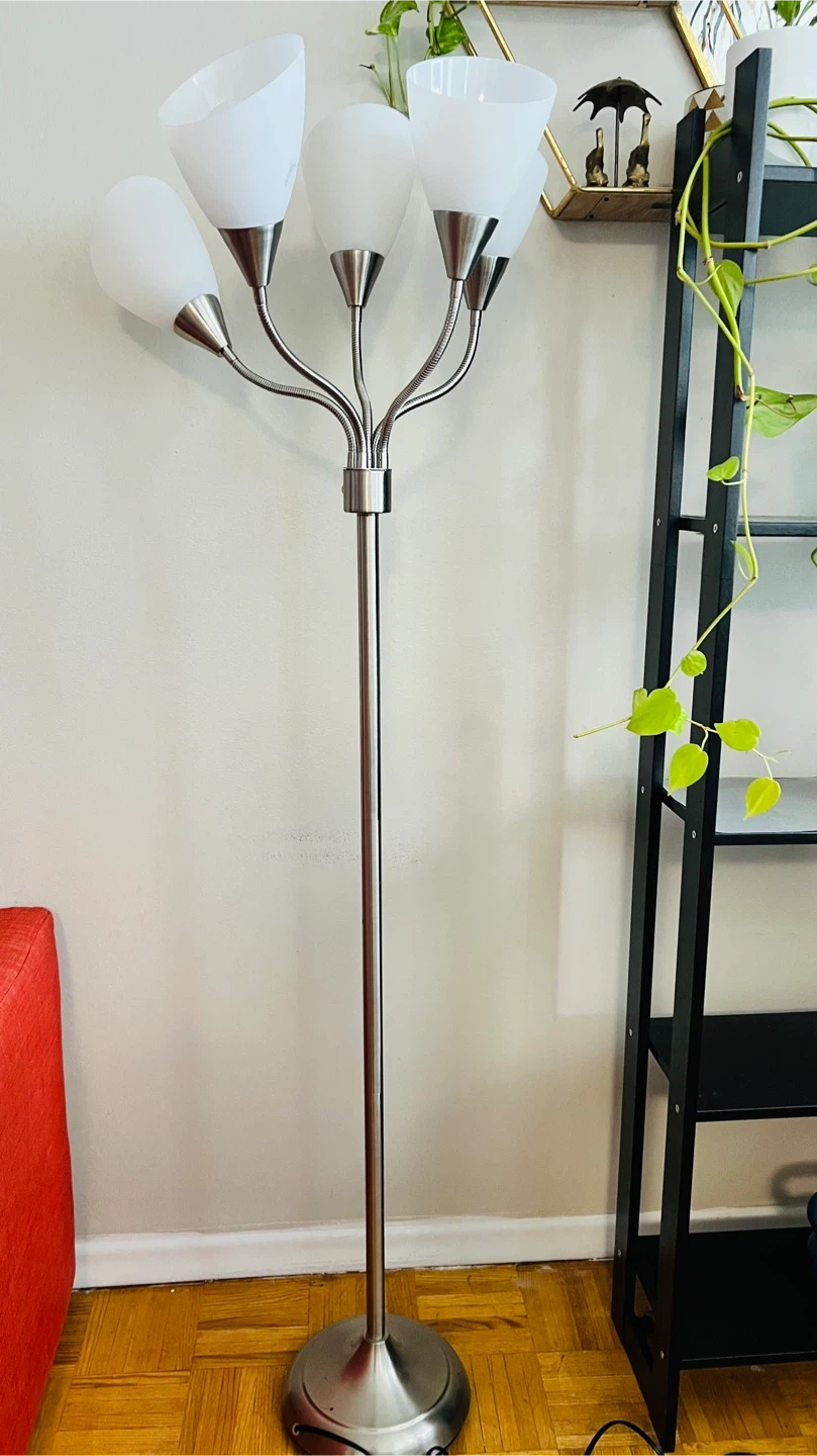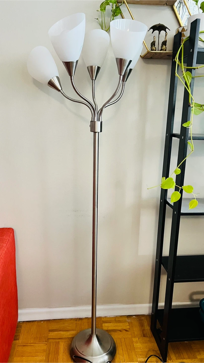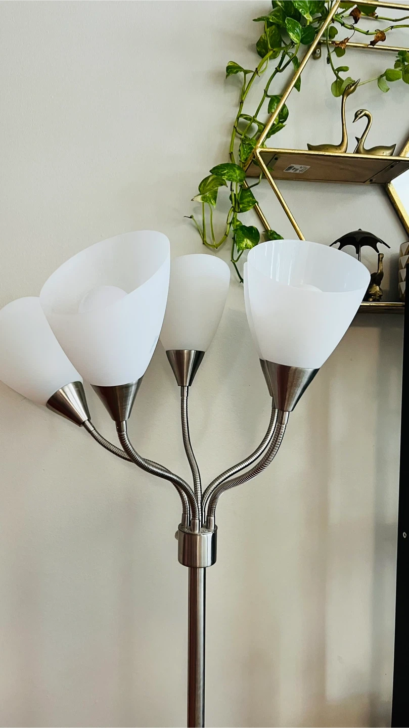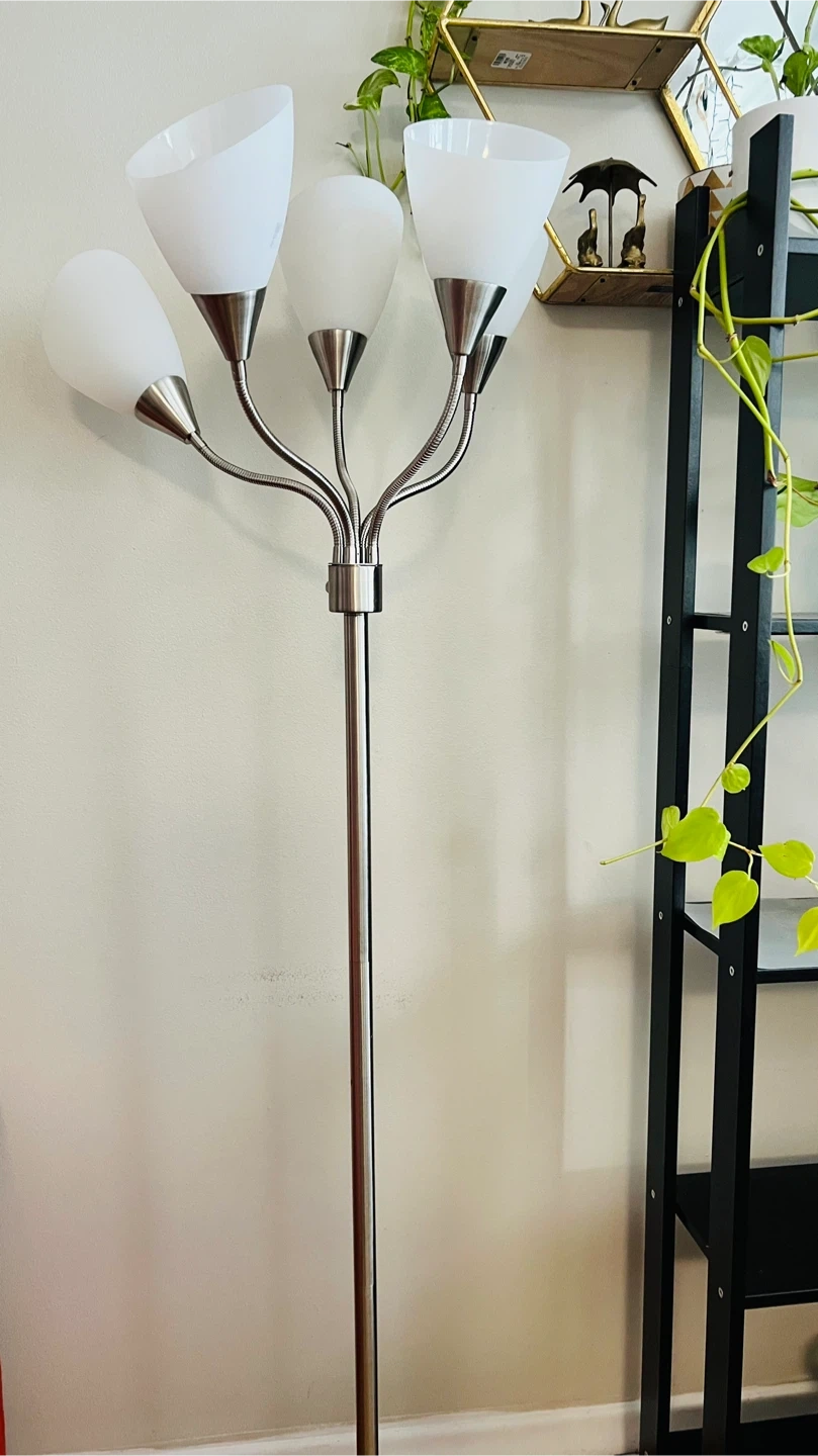 Selling a floor lamp with a sleek silver finish and five lights! It's in great shape and ready to brighten up your space. Perfect for adding some extra light to any room in your home