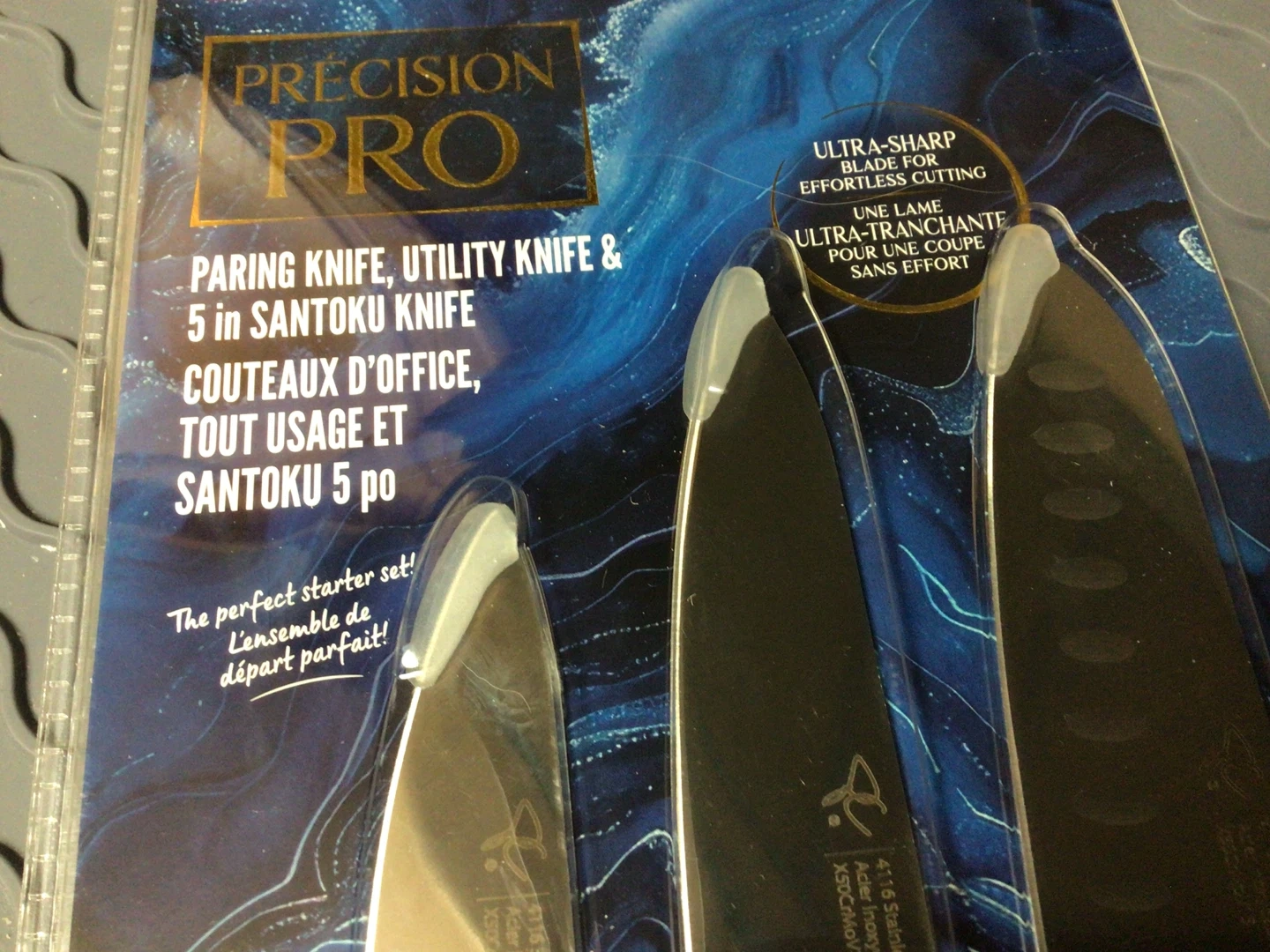Selling a Precision Pro knife set, still in its original packaging! This set includes a paring knife, a utility knife, and a 5-in santoku knife. It's the perfect starter set for anyone looking to upgrade their kitchen knives. The blades are ultra-sharp for effortless cutting. The knives feature a triple-riveted handle for durability and control, and a bolstered design for comfort, safety, and precise handling