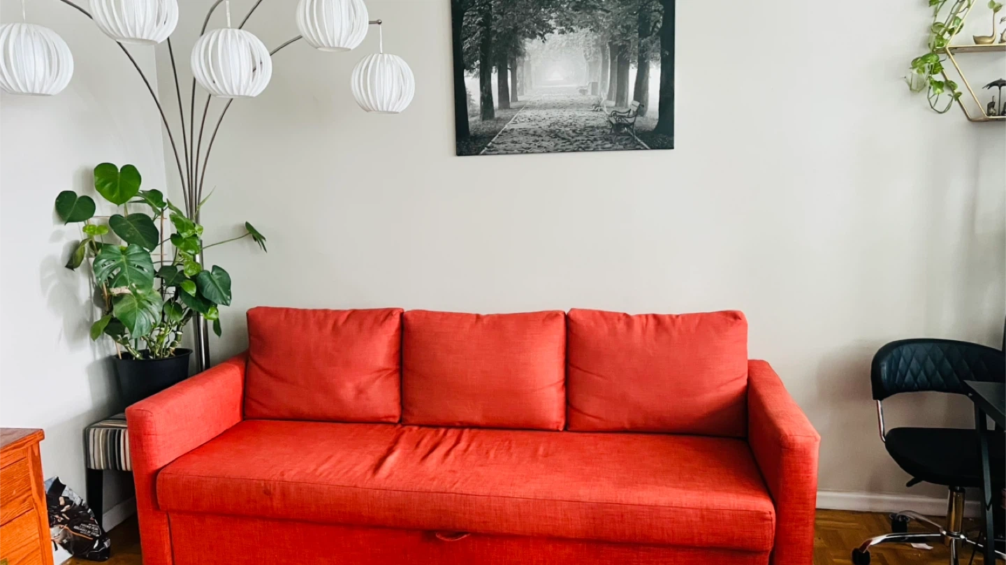 IKEA FRIHETEN sofa bed in good condition. Pull-out sofa that easily converts into a bed. Includes built-in storage space for bedding or other items. Clean and well maintained.