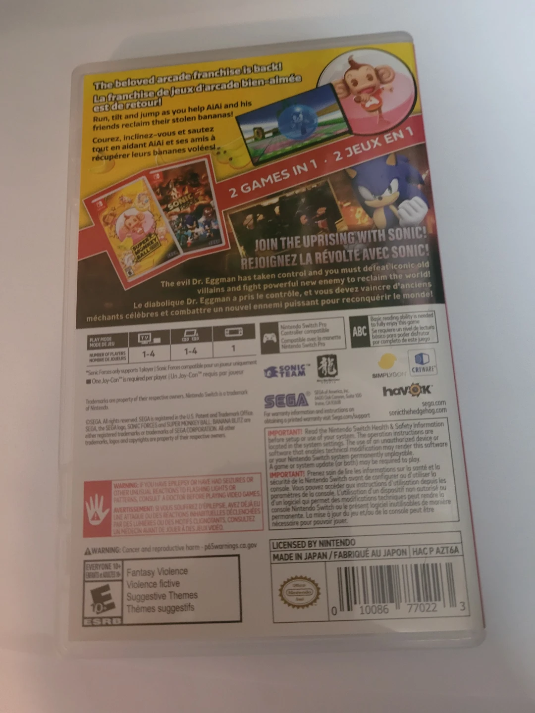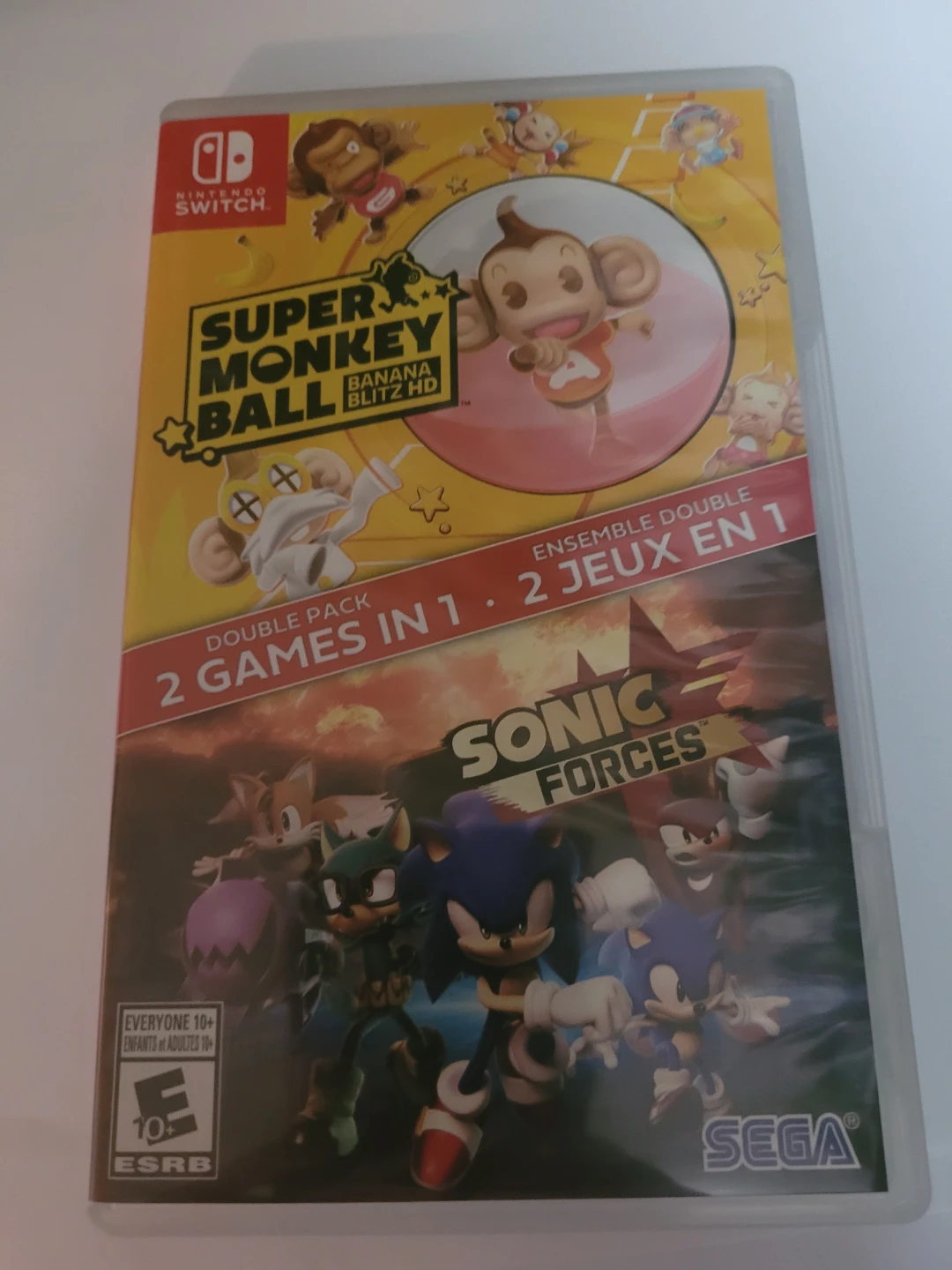 Selling a double pack of games for the Nintendo Switch! This includes Super Monkey Ball Banana Blitz HD and Sonic Forces. Rated E for Everyone 10+.
