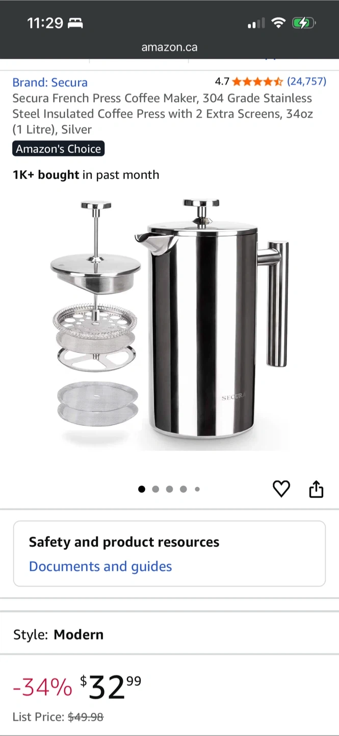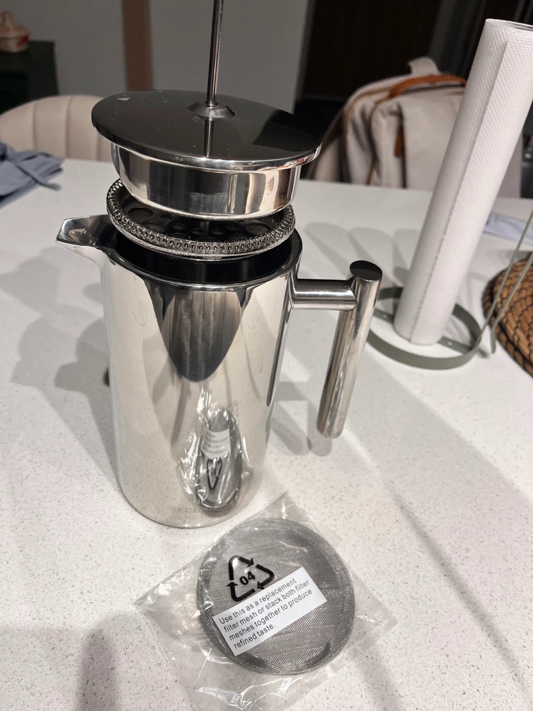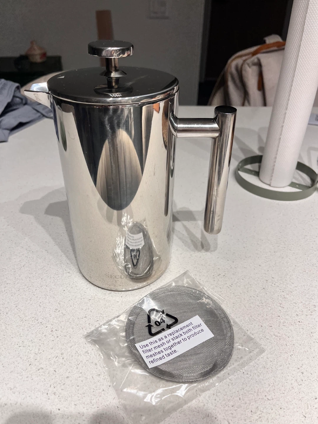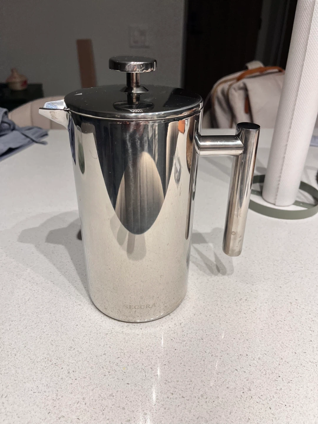 Stainless steel Secura French Press. Holds 34 oz or 1L so you can make several cups at a time. I only used a handful of times but decided I don’t like coffee enough to use it properly. Bought on Amazon for approx $32.