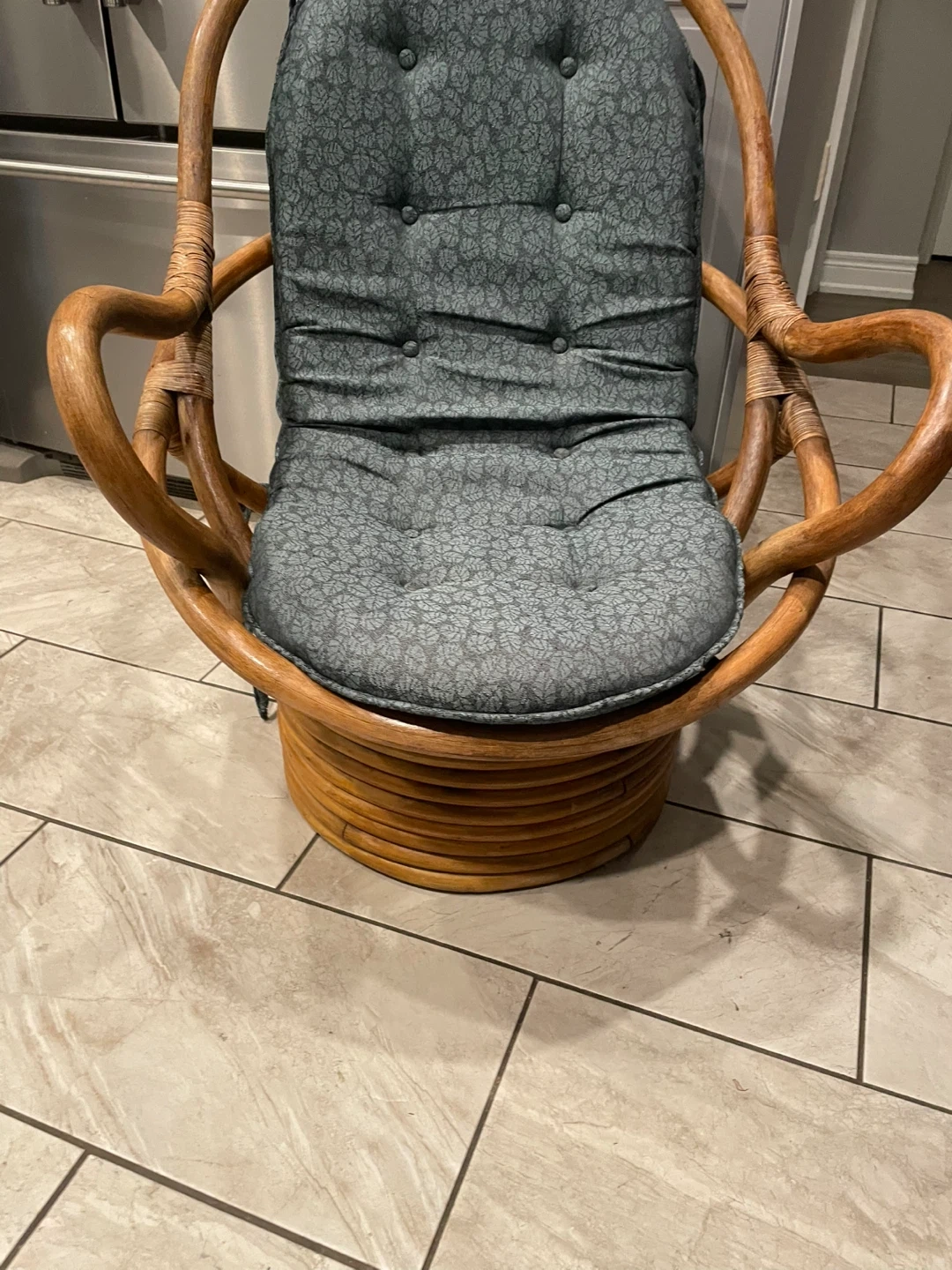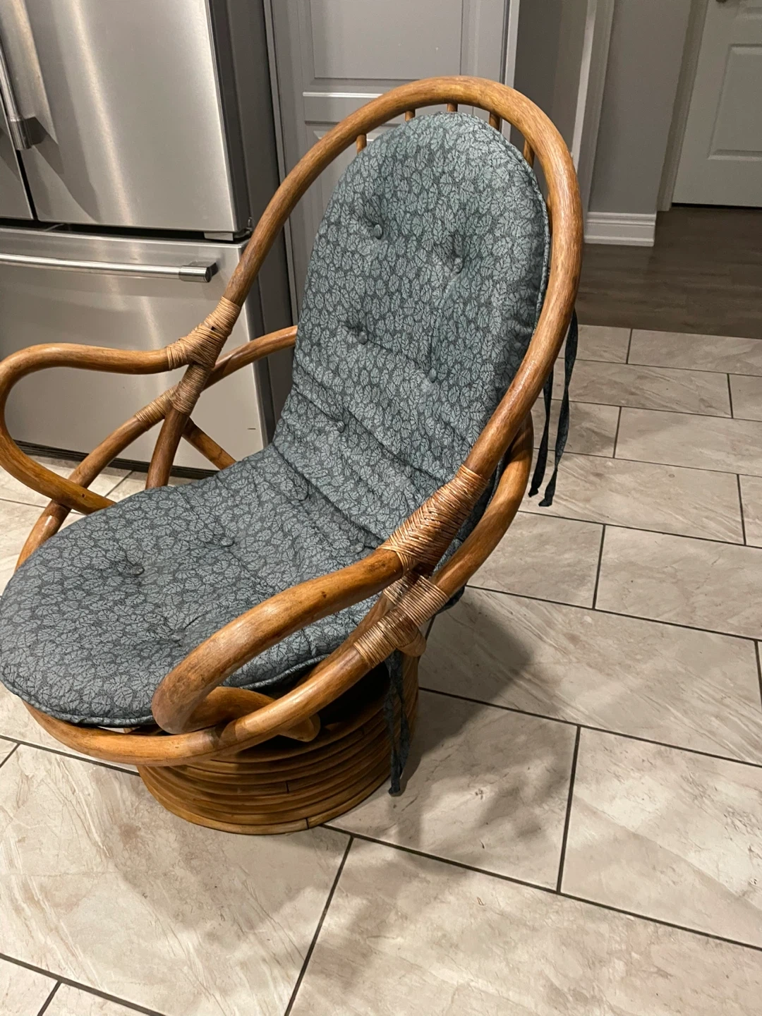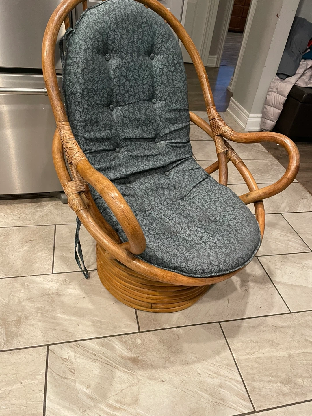 Comfortable rattan swivel chair with a patterned cushion. It's in great shape and ready for a new space in your home!