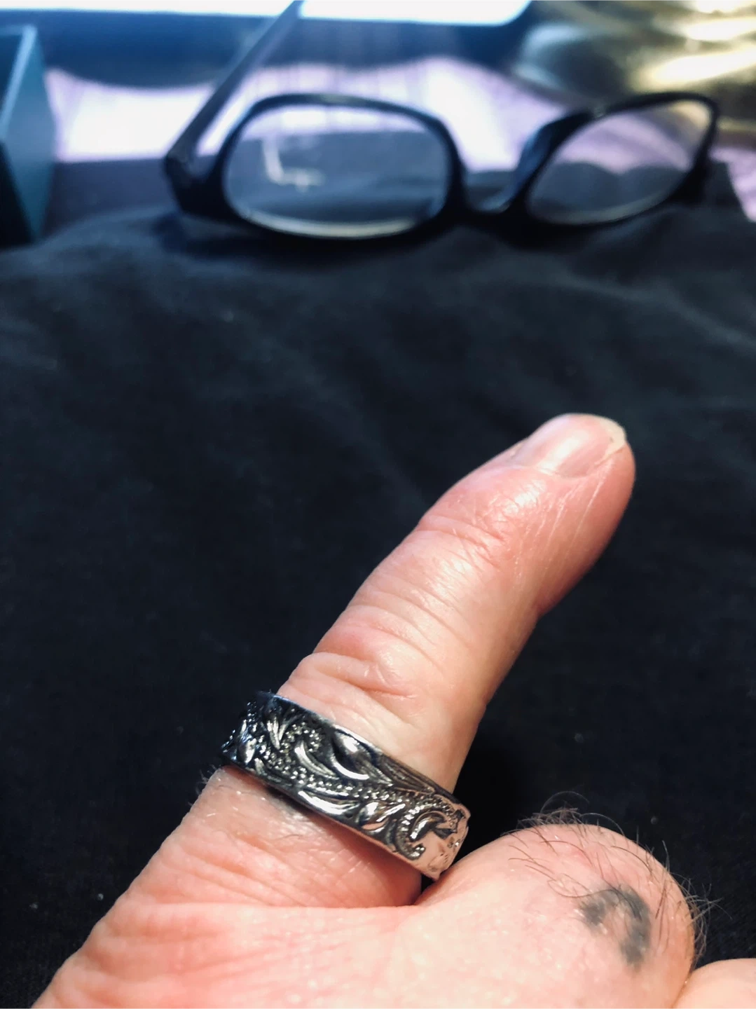 Selling a silver ring with a detailed floral design. It's in great condition and ready to wear! The ring has an intricate pattern that adds a touch of elegance. Perfect for everyday wear or a special 🥕