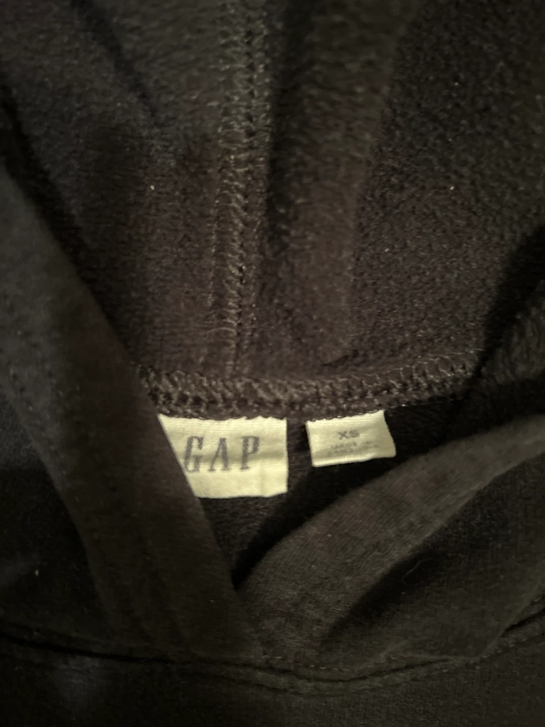 Selling a black GAP hoodie in size XS. It's in great condition and perfect for layering or wearing on its own. The classic GAP logo is featured prominently on the front