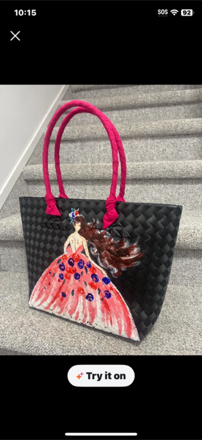 Check out this unique handmade woven tote bag! It features a beautiful dress design and sturdy pink handles. Perfect for adding a touch of artistry to your everyday errands pick up cash only