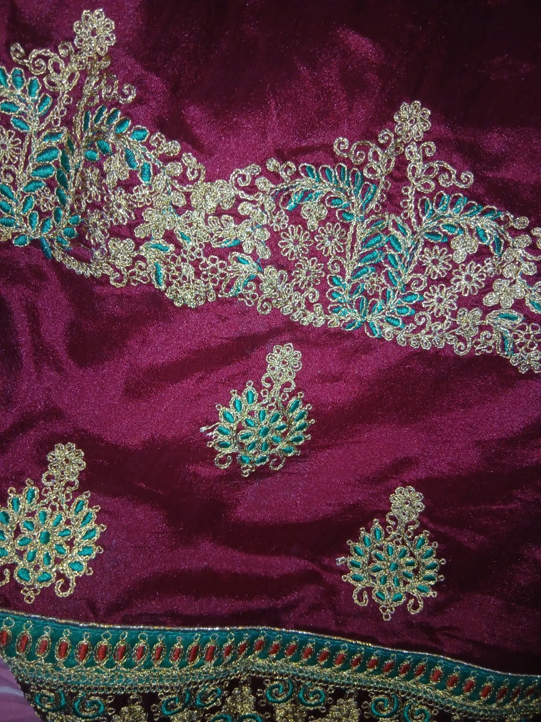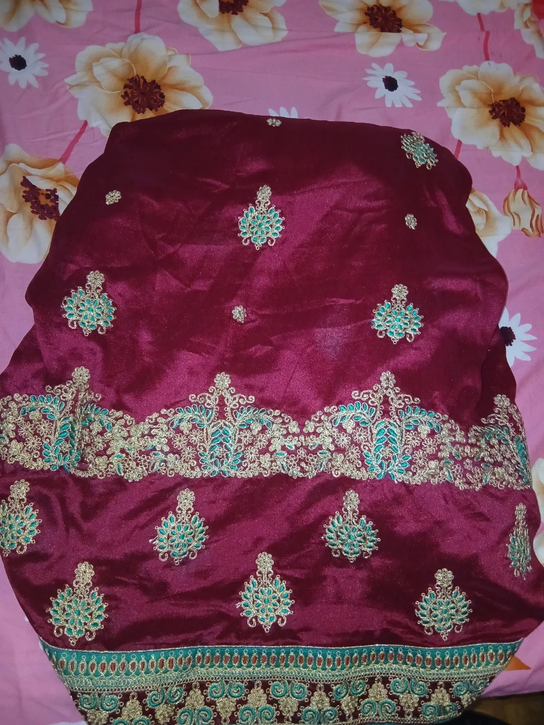 NEED GONE ASAP, dark red saree with gold, green embroidered work