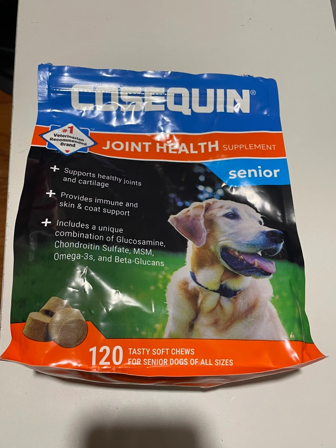 It supports healthy joints and cartilage and provides immune and skin & coat support. Includes a unique combination of Glucosamine, Chondroitin Sulfate, MSM, Omega-3s, and Beta-Glucans. Expiration date is July 2027. Please see photos