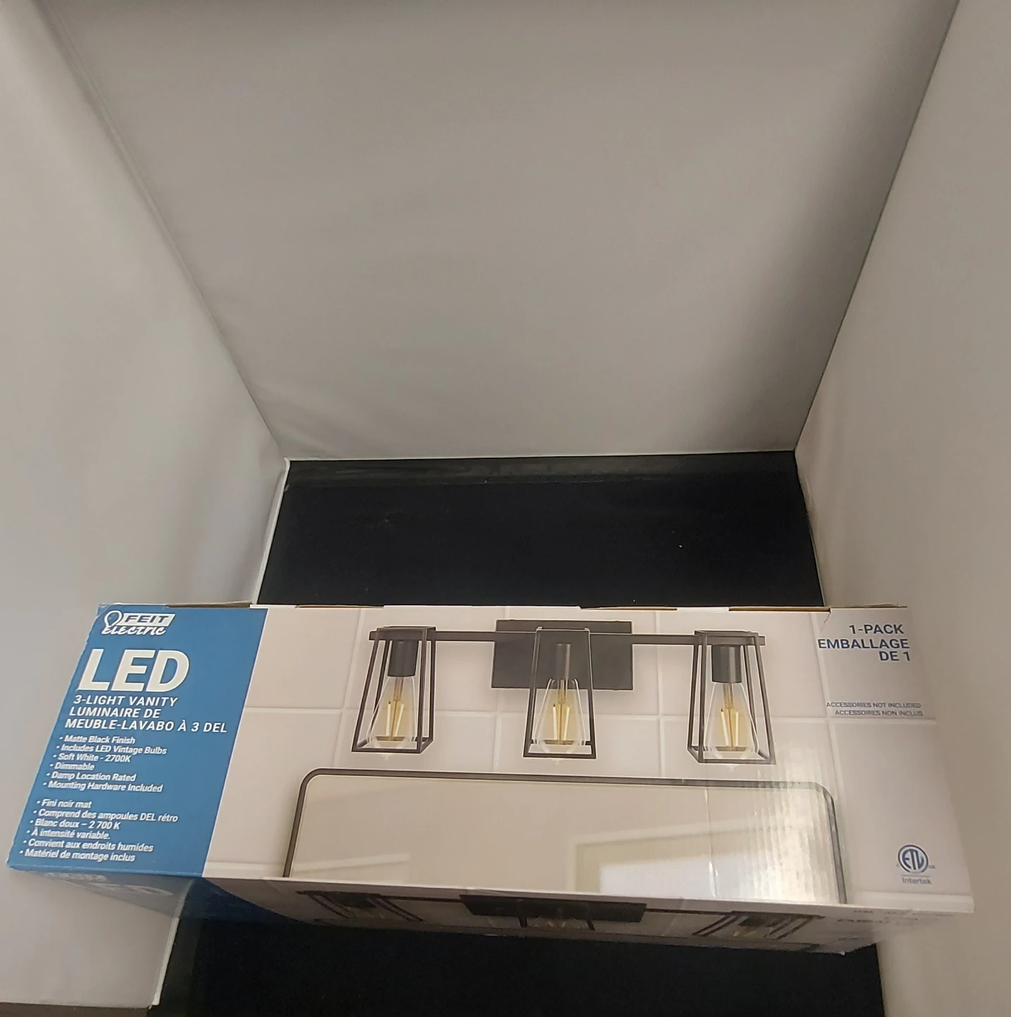 Selling a Feit Electric 3-Light LED Vanity Light in matte black finish. 185 im box & willimg to negotiate. It comes with vintage bulbs and is dimmable. Suitable for damp locations. Mounting hardware is included. The dimensions are 53.3 cm / 20.9 in W x 20.1 cm / 7.9 in H x 17.7 cm / 6.9 in D