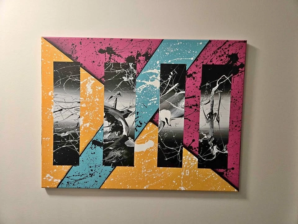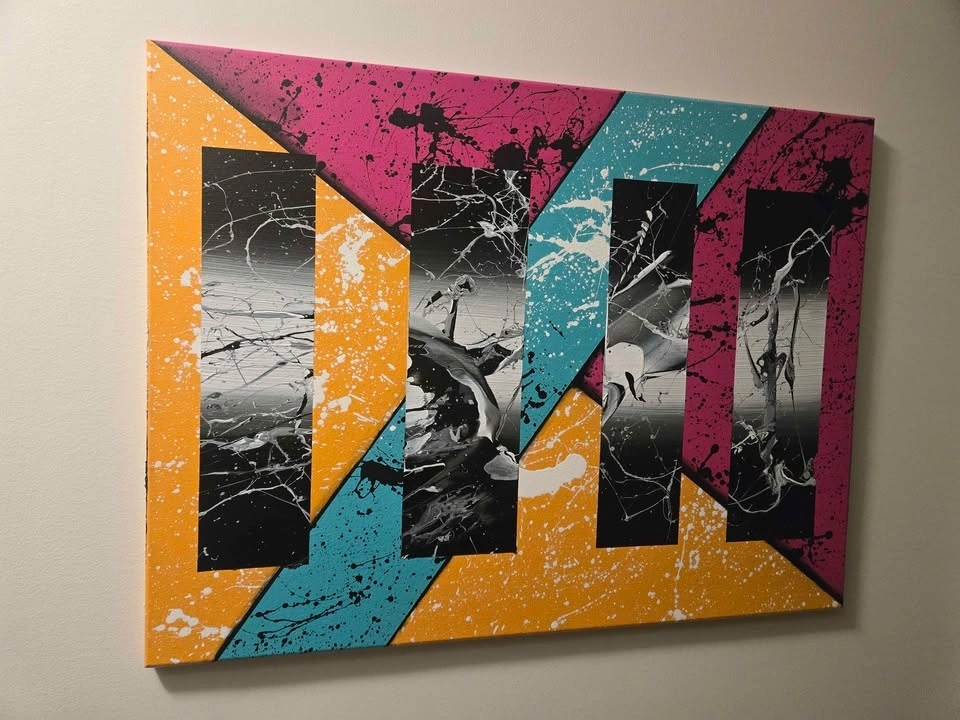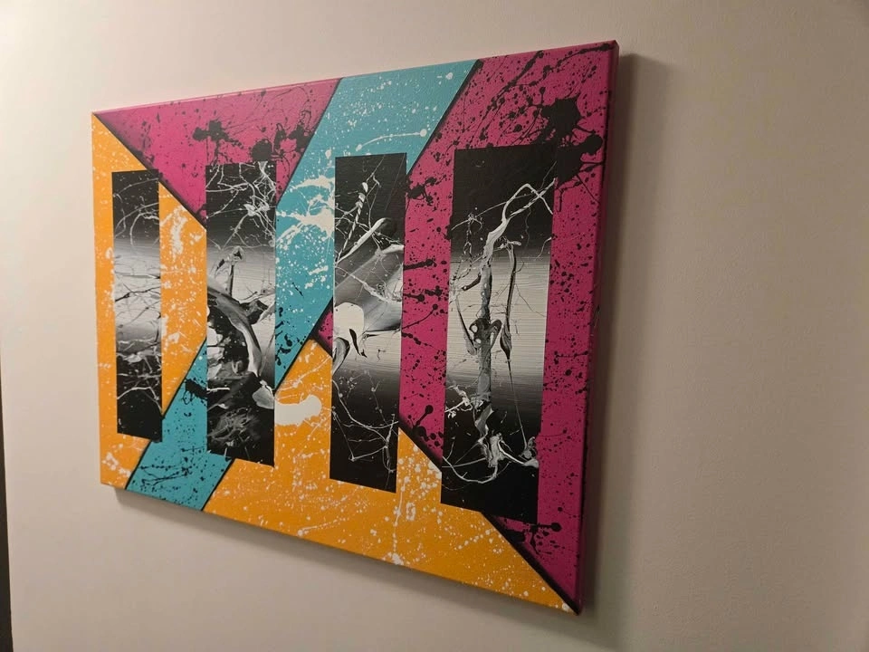 16x20 canvas piece creates by HD Acrylics. Very cool vibe going on with vivid colors. White, Grey, and black lay across a background of pink, poolside blue, and yellow.