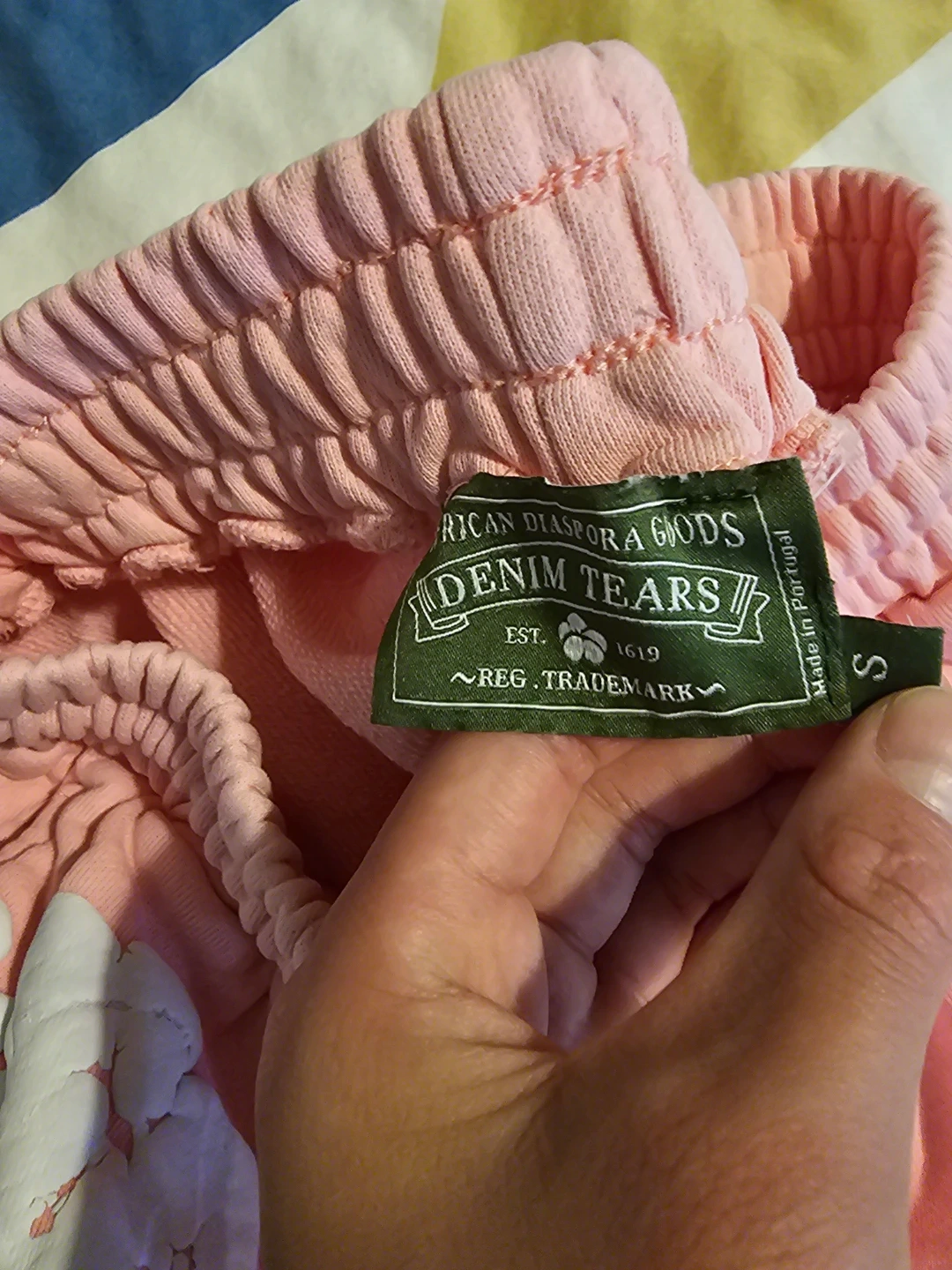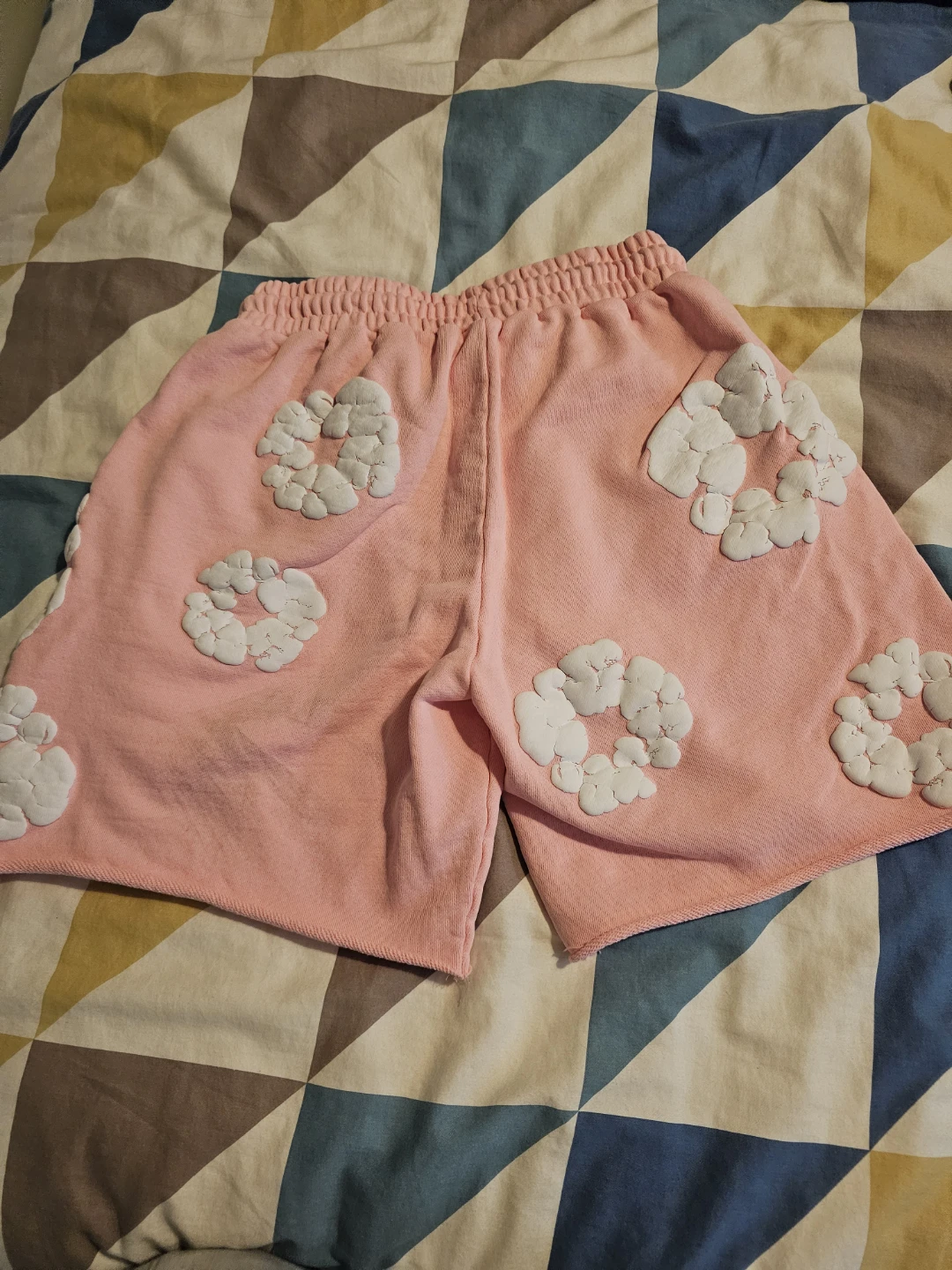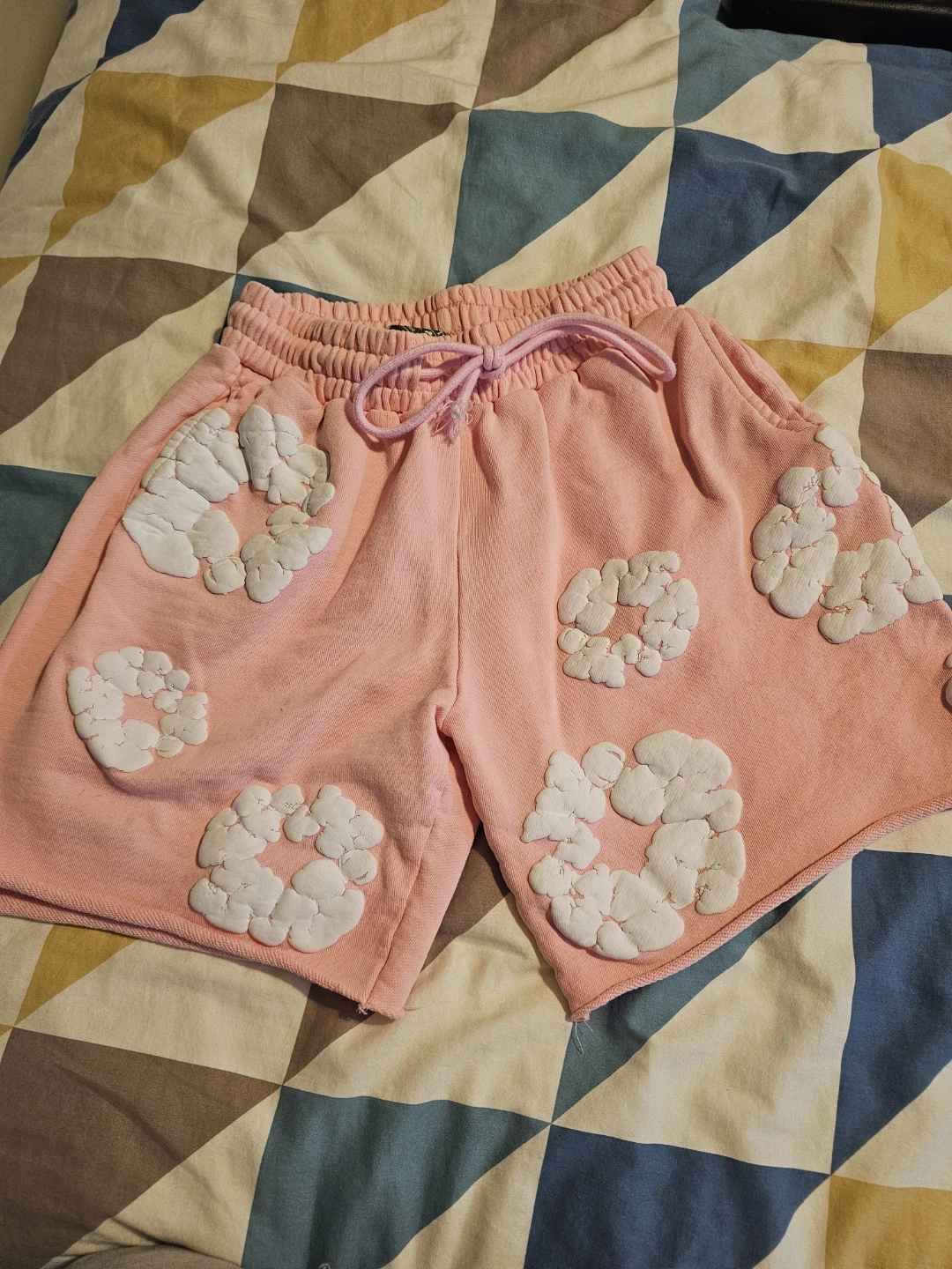 REPS selling a pair of cute Denim Tears shorts! They're a lovely pink colour and size small. They feature a unique cloud design on the front and back. Perfect for casual wear or lounging around the house