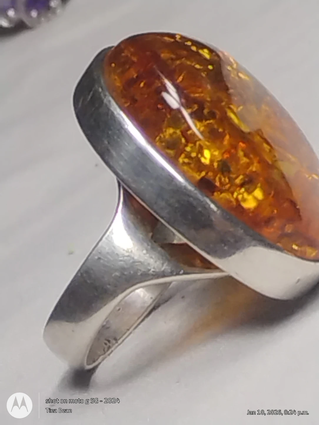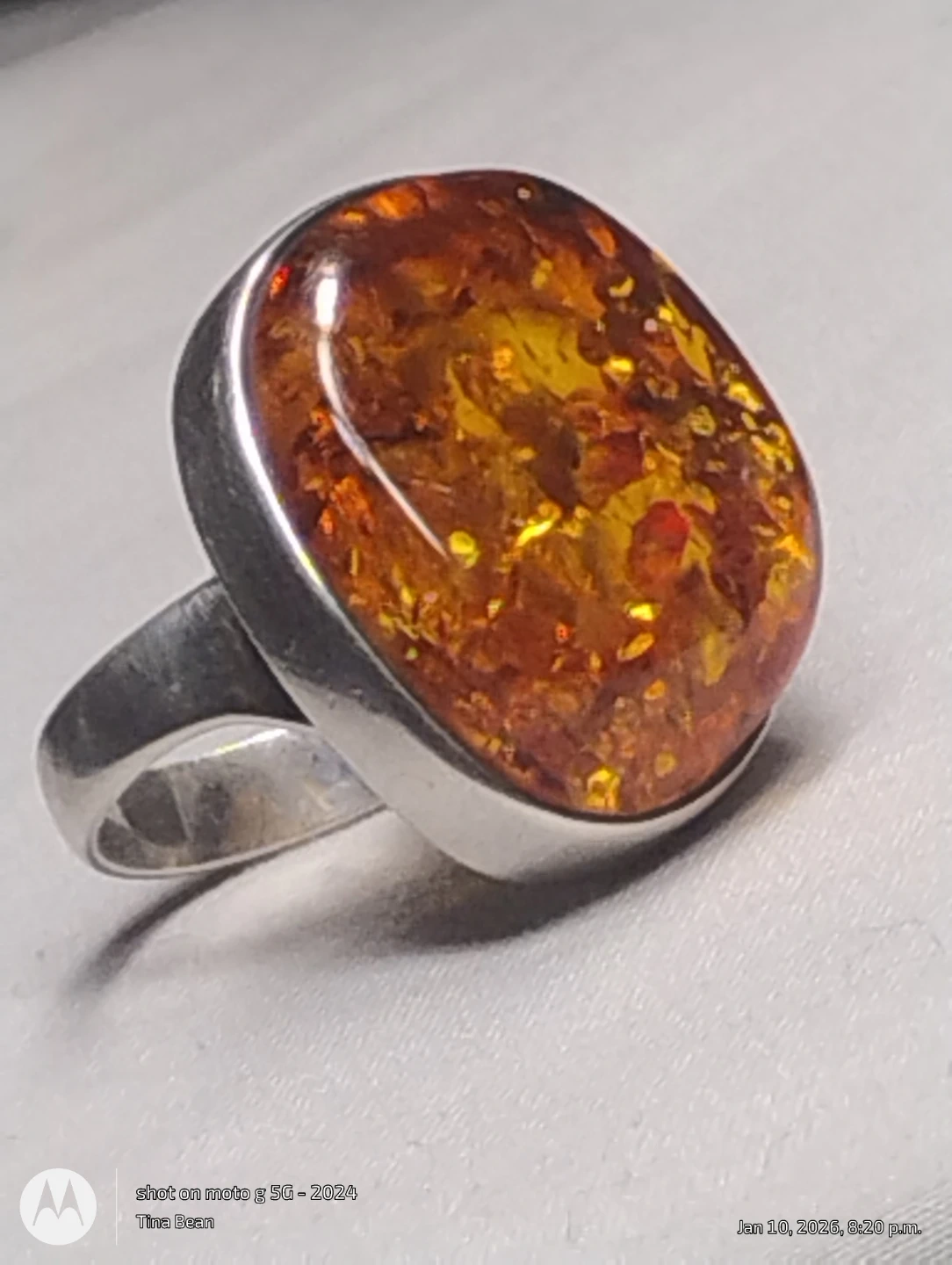 Beautiful amber ring set in sterling silver. It's in great condition and ready to wear! The amber has lovely golden tones with amazing flash in the sun. This is a big ring.